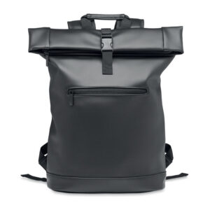 Zippered rolltop 15 inch laptop backpack in recycled pre-consumer cotton and recycled polyester (70%/30%). Front zippered pocket. Padded back and shoulder straps. 340gr/m².