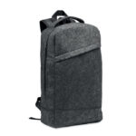 13 inch laptop backpack in RPET felt with padded shoulder and strap with a main internal compartment. Zippered compartment inside. Trolley holder on reverse side.