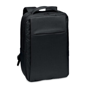 Laptop backpack in 600D 2 tone polyester with padded shoulder strap including one main internal compartment for 15 inch laptop and a USB charging cable. Includes magnetic snap button closure and one zippered front compartment.