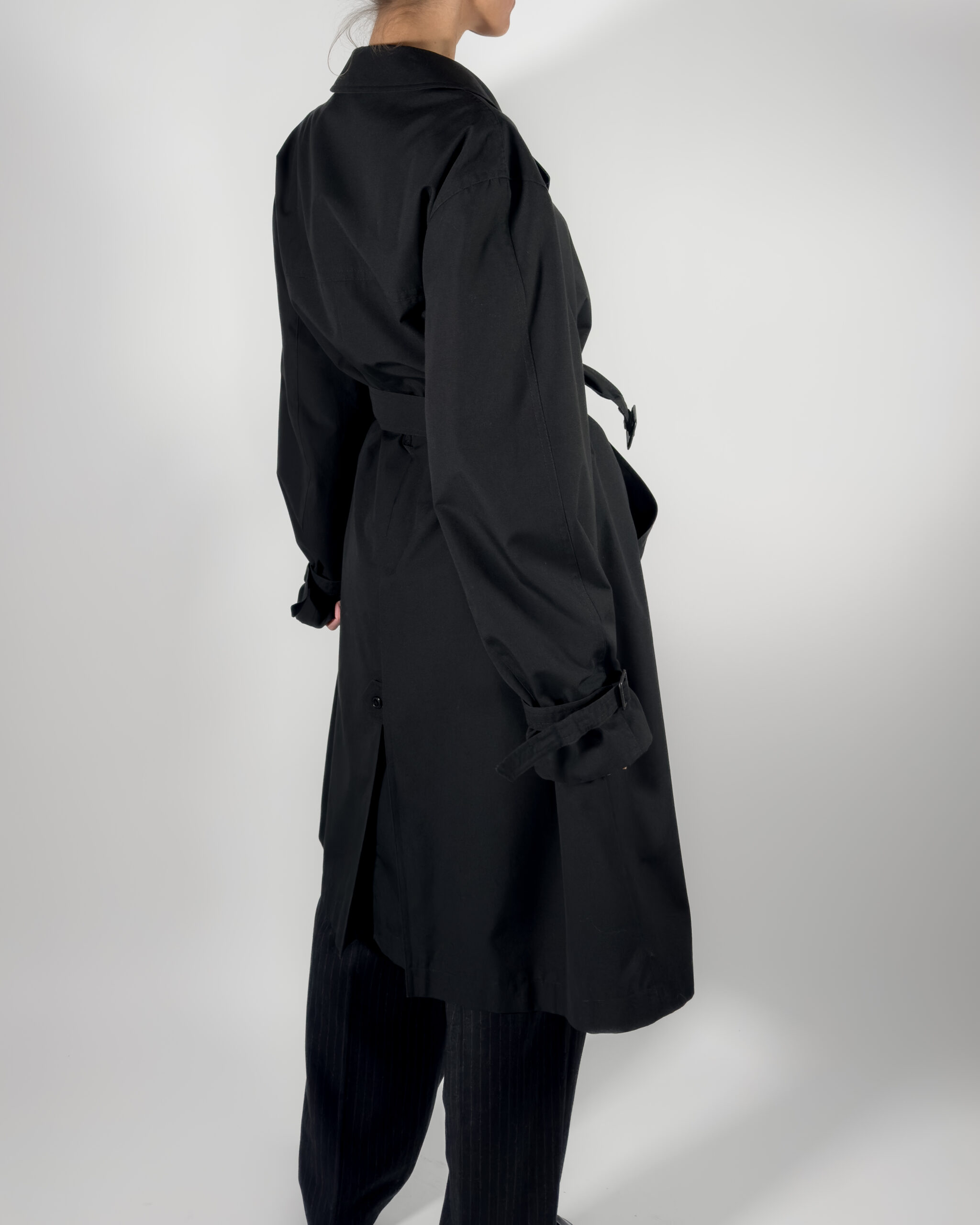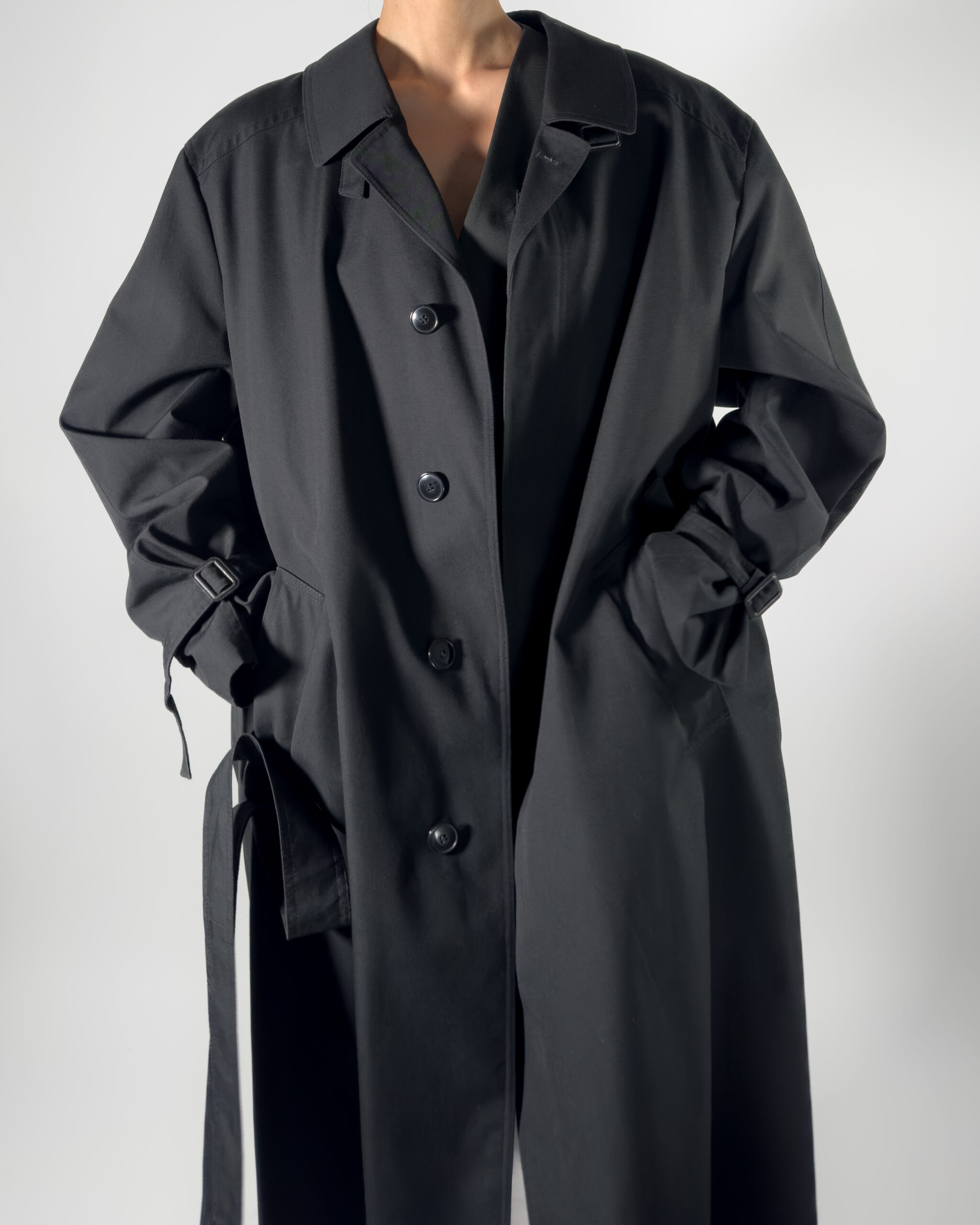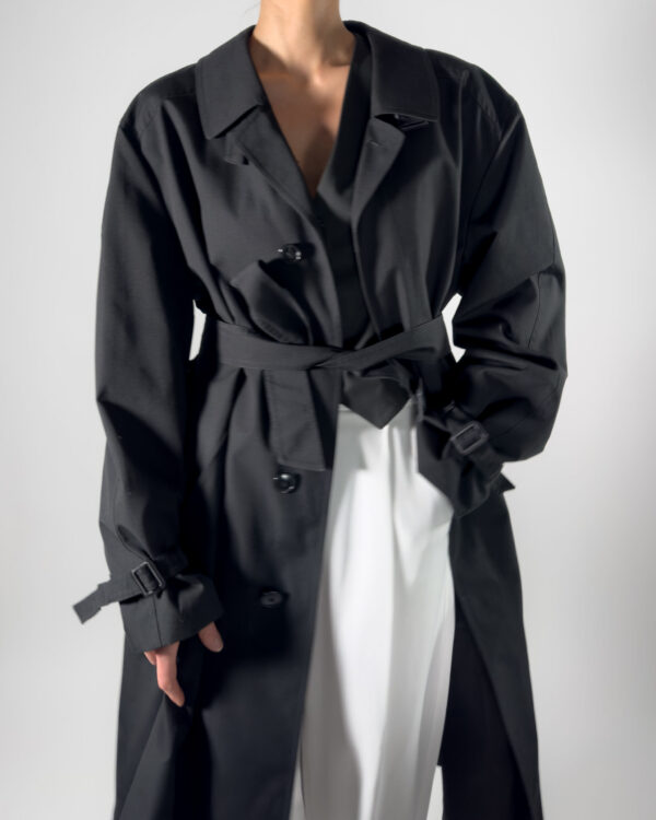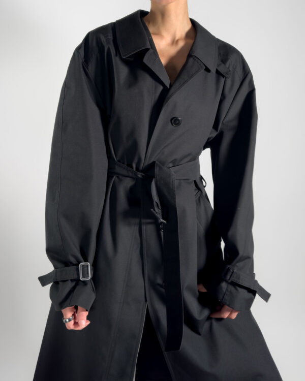 This belted trench coat combines a classic design with functional details, including hidden button-up closure, a back slit, and two front pockets, along with inner pockets.