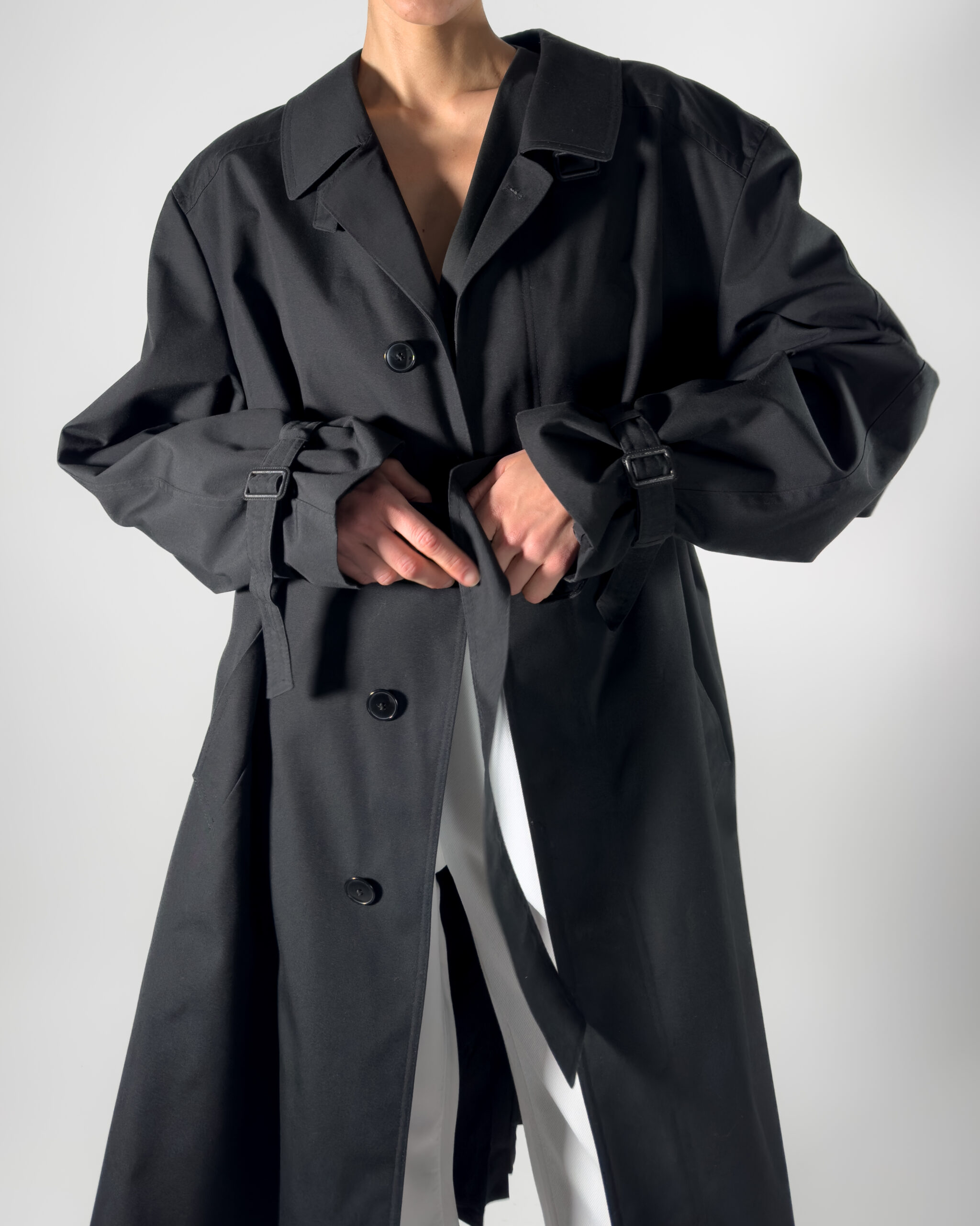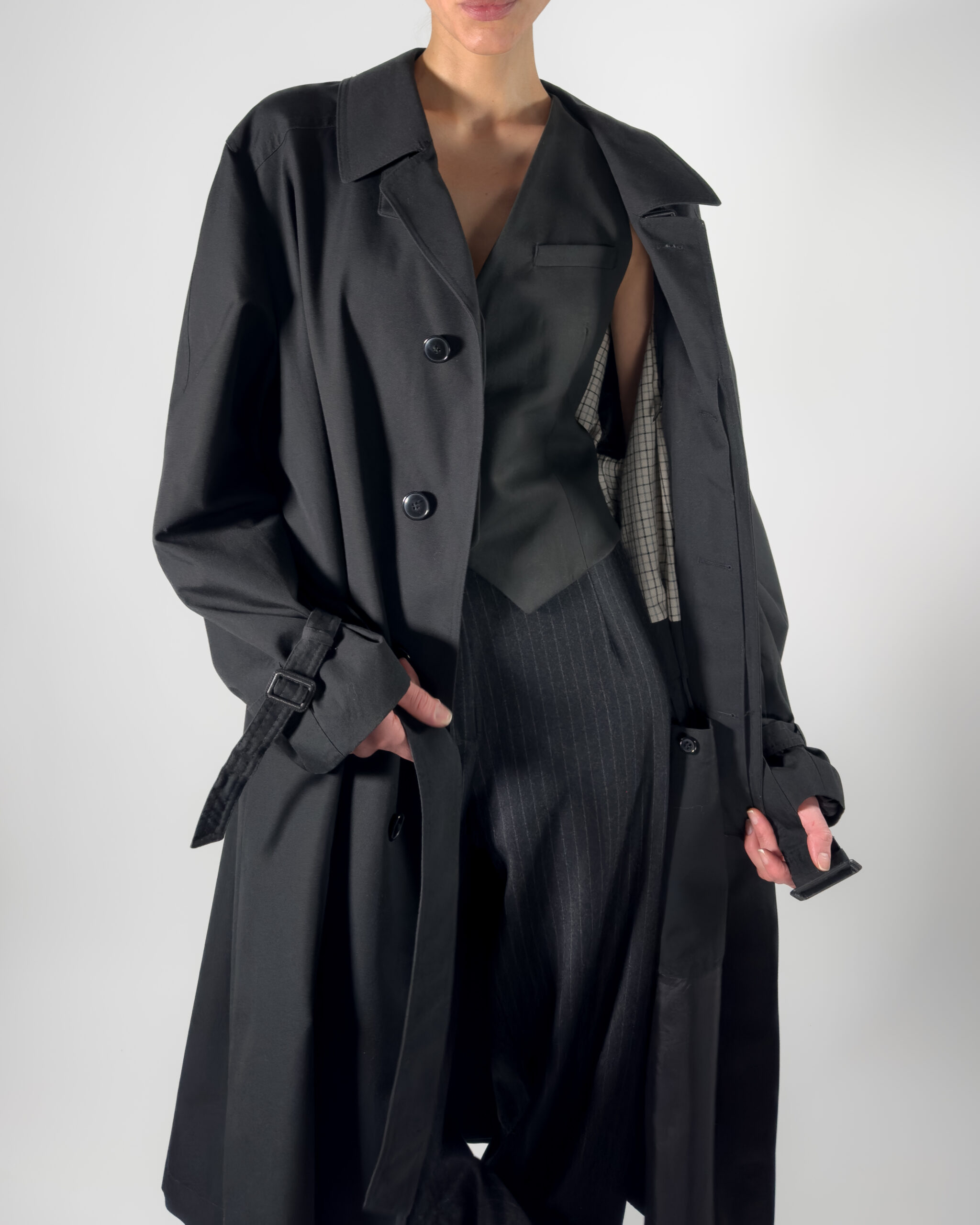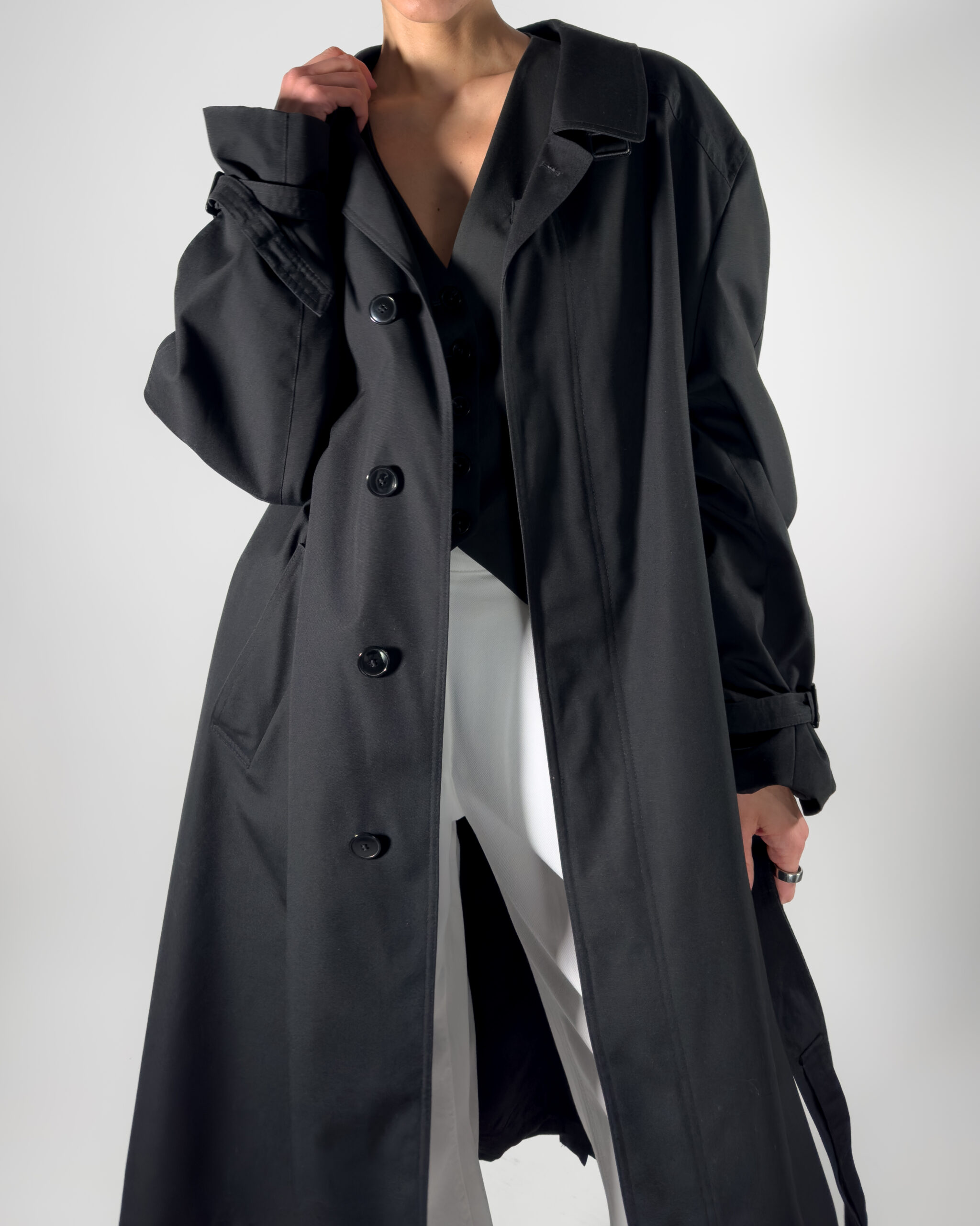 This belted trench coat combines a classic design with functional details, including hidden button-up closure, a back slit, and two front pockets, along with inner pockets.