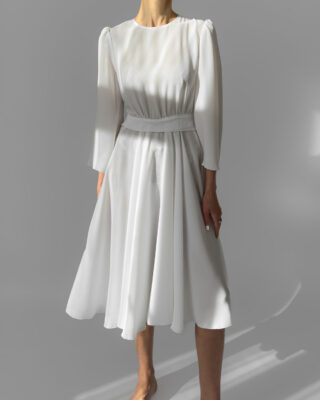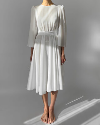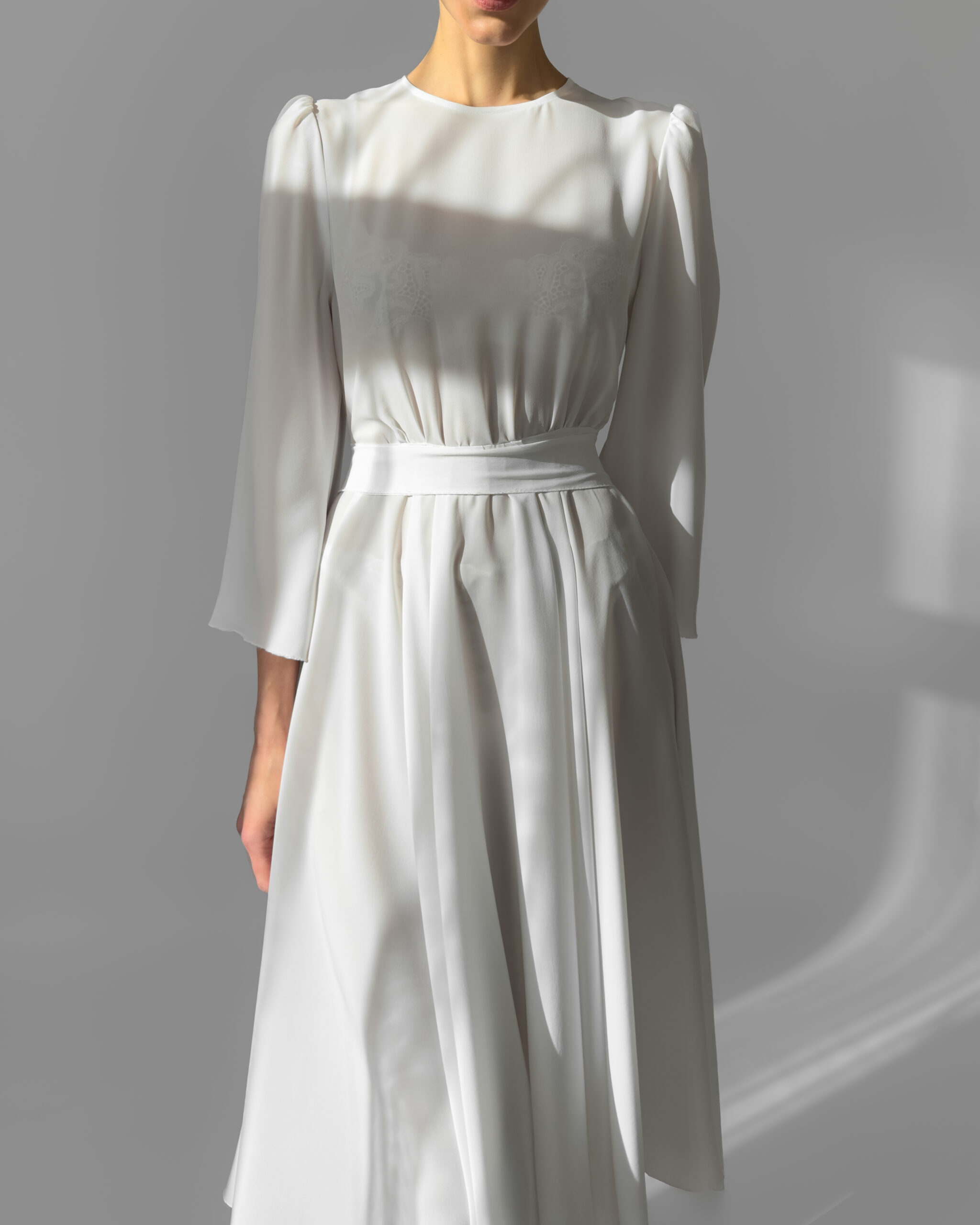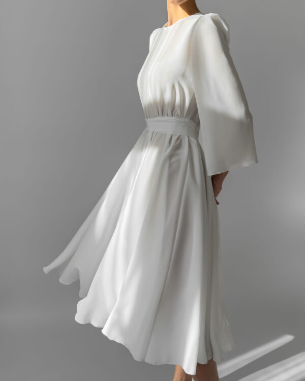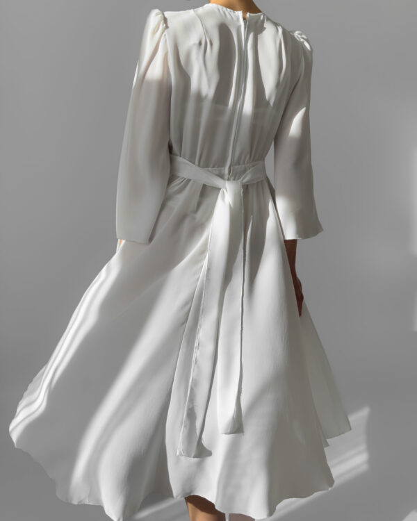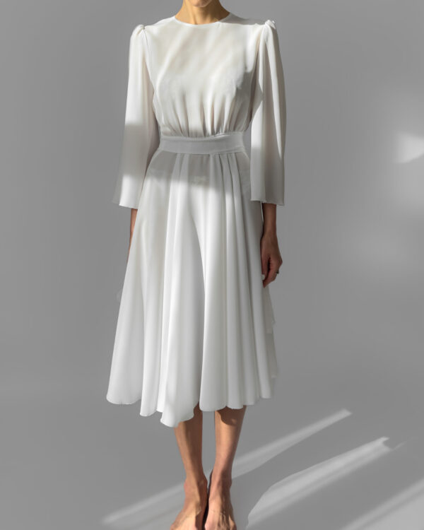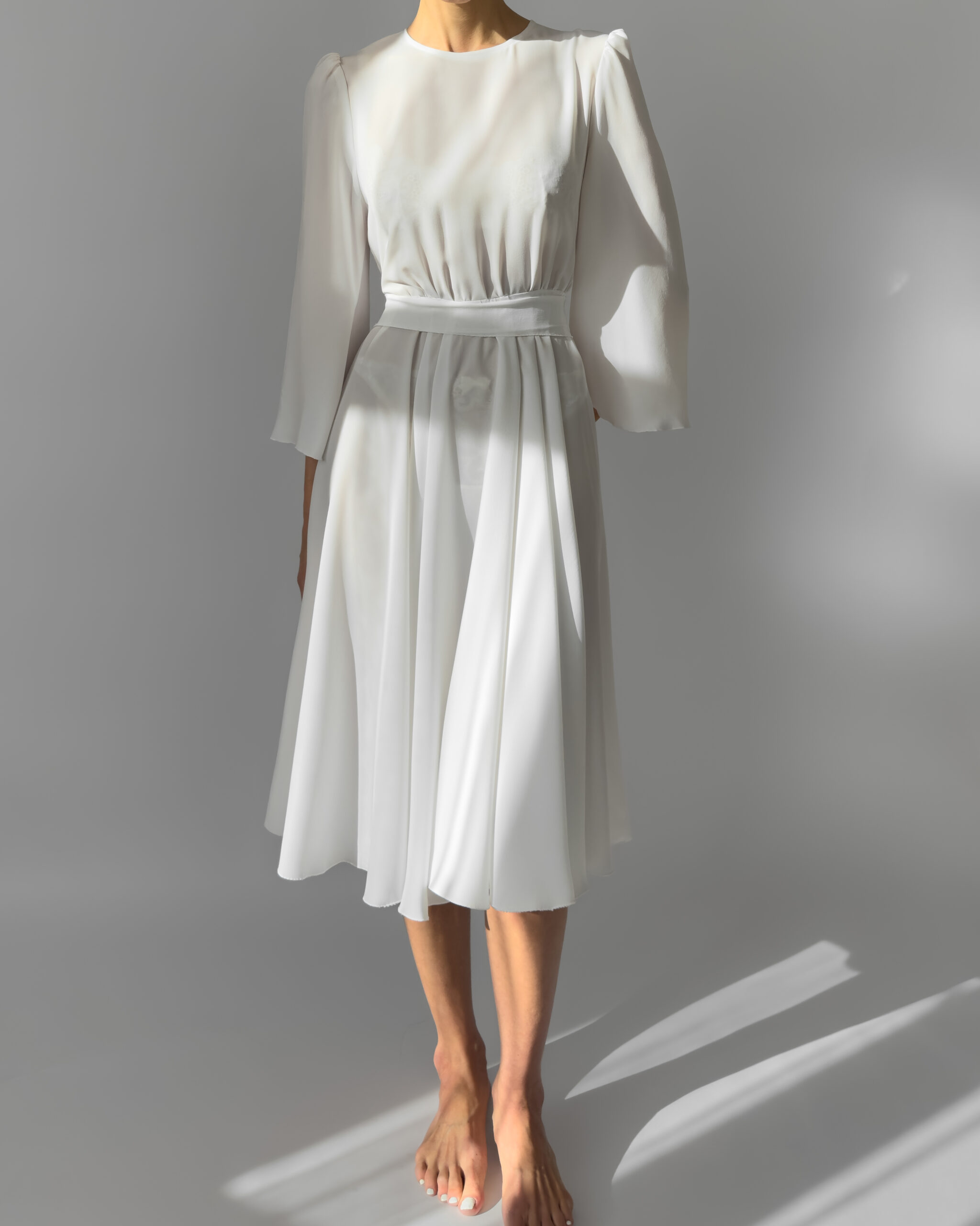 White midi dress with a soft viscose-blend feel. Featurin back zipper closure and graceful flowy silhouette. Elegant 3/4 sleeves and clean lines make it perfect for special occasions.
