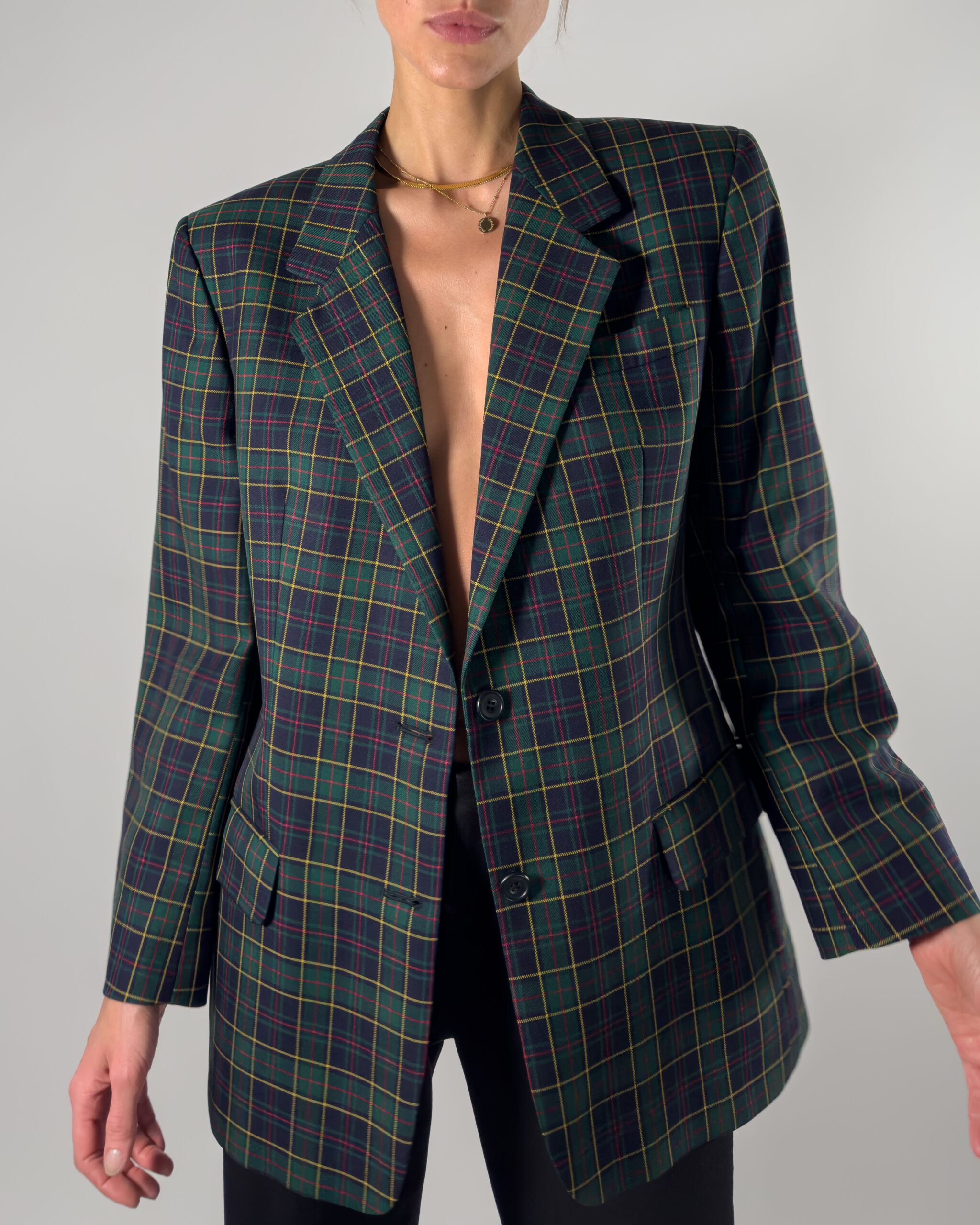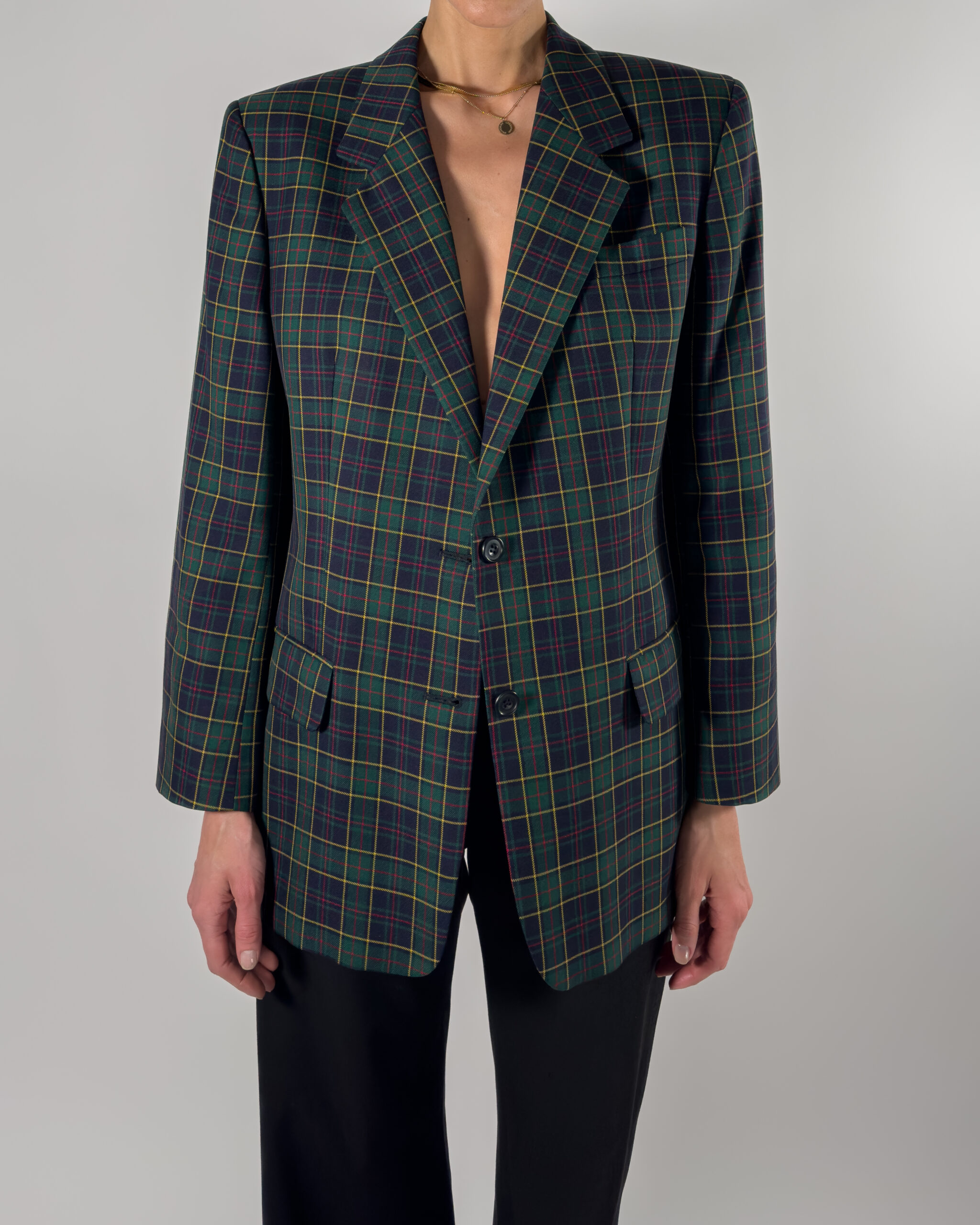 Classic checkered wool blazer from DAKS London, timeless design in dark blue and green. Made in Great Britain.