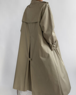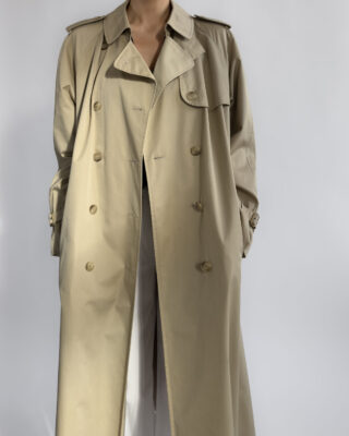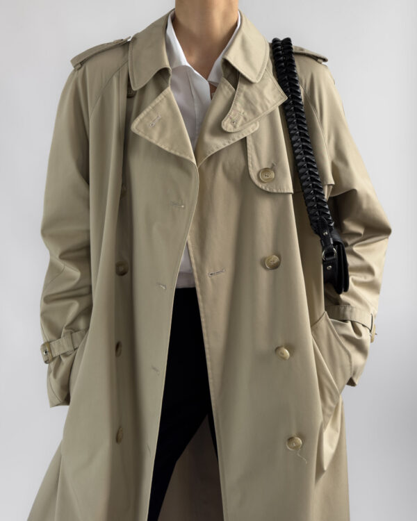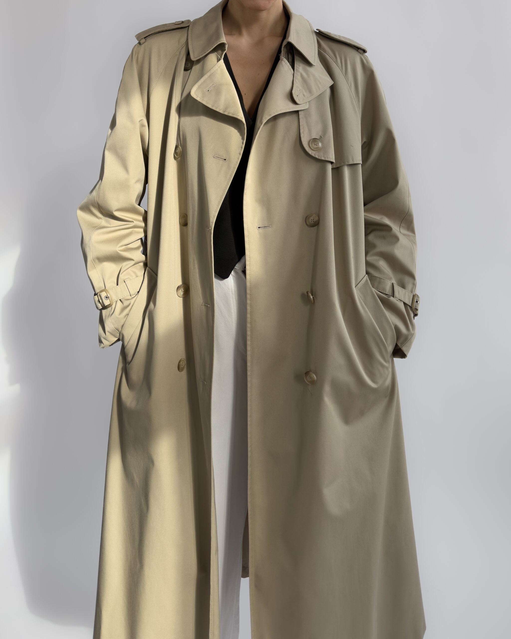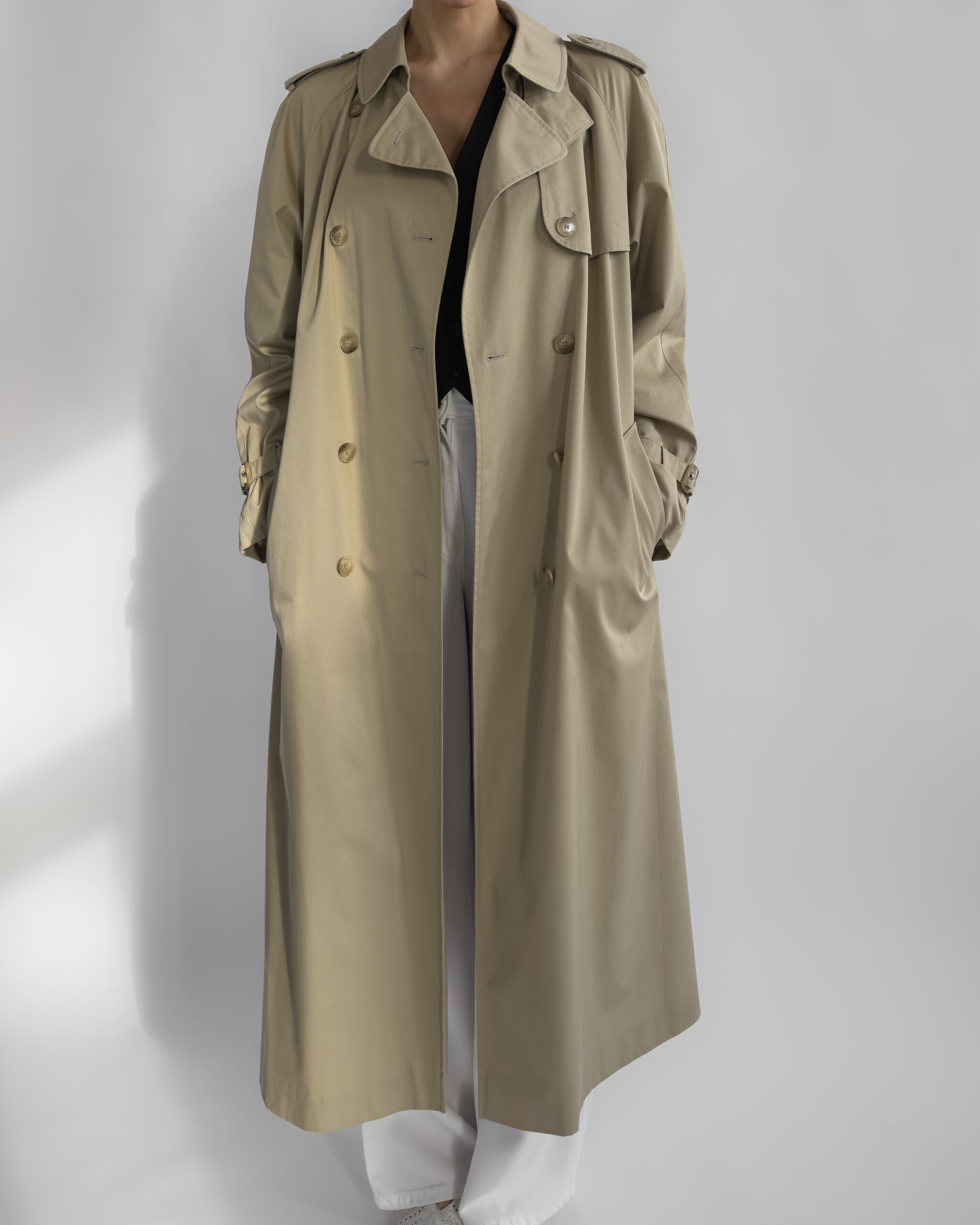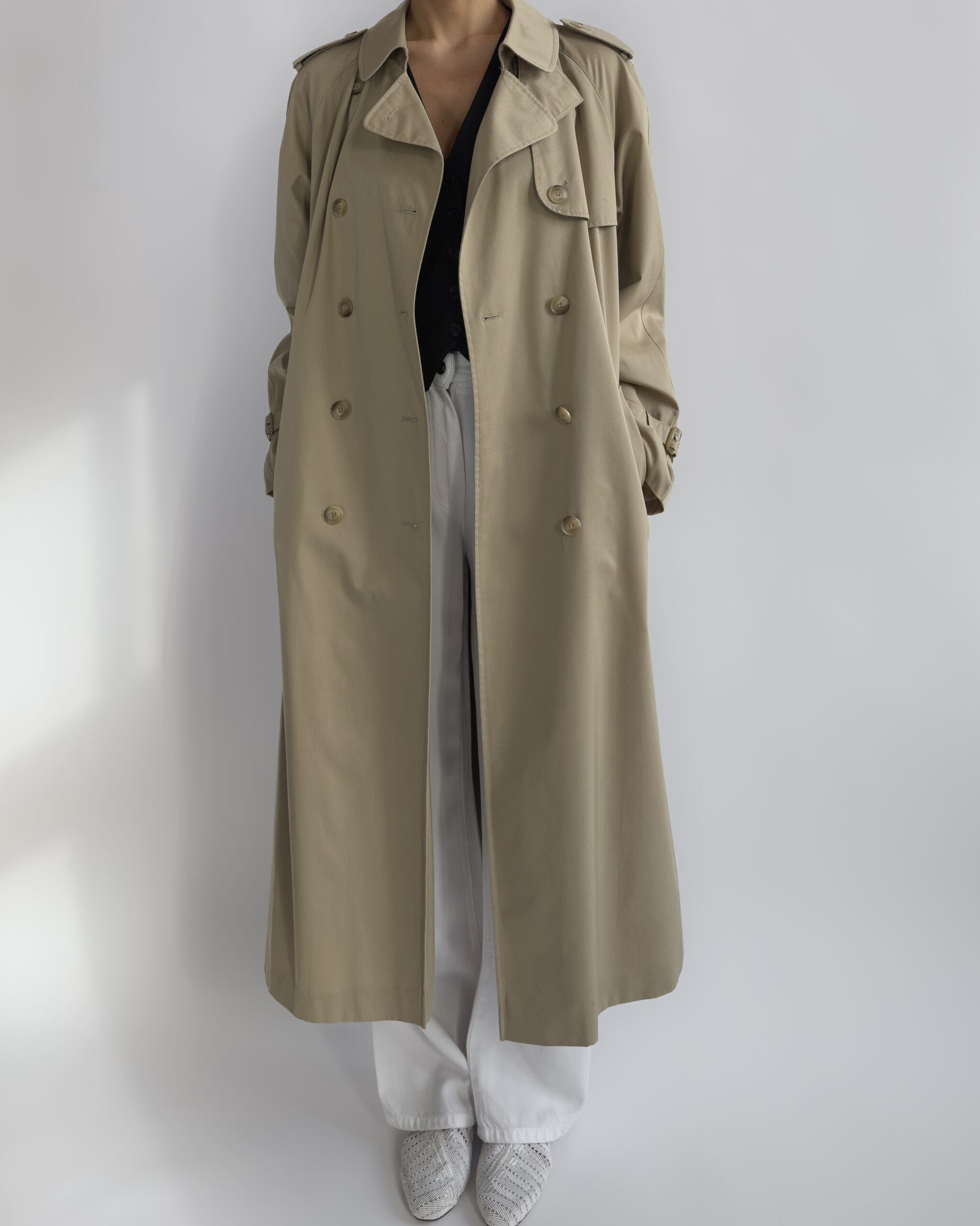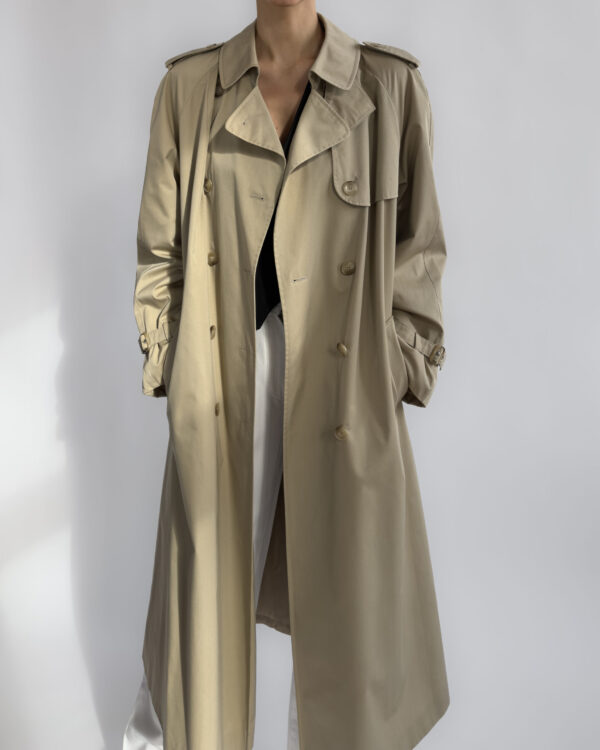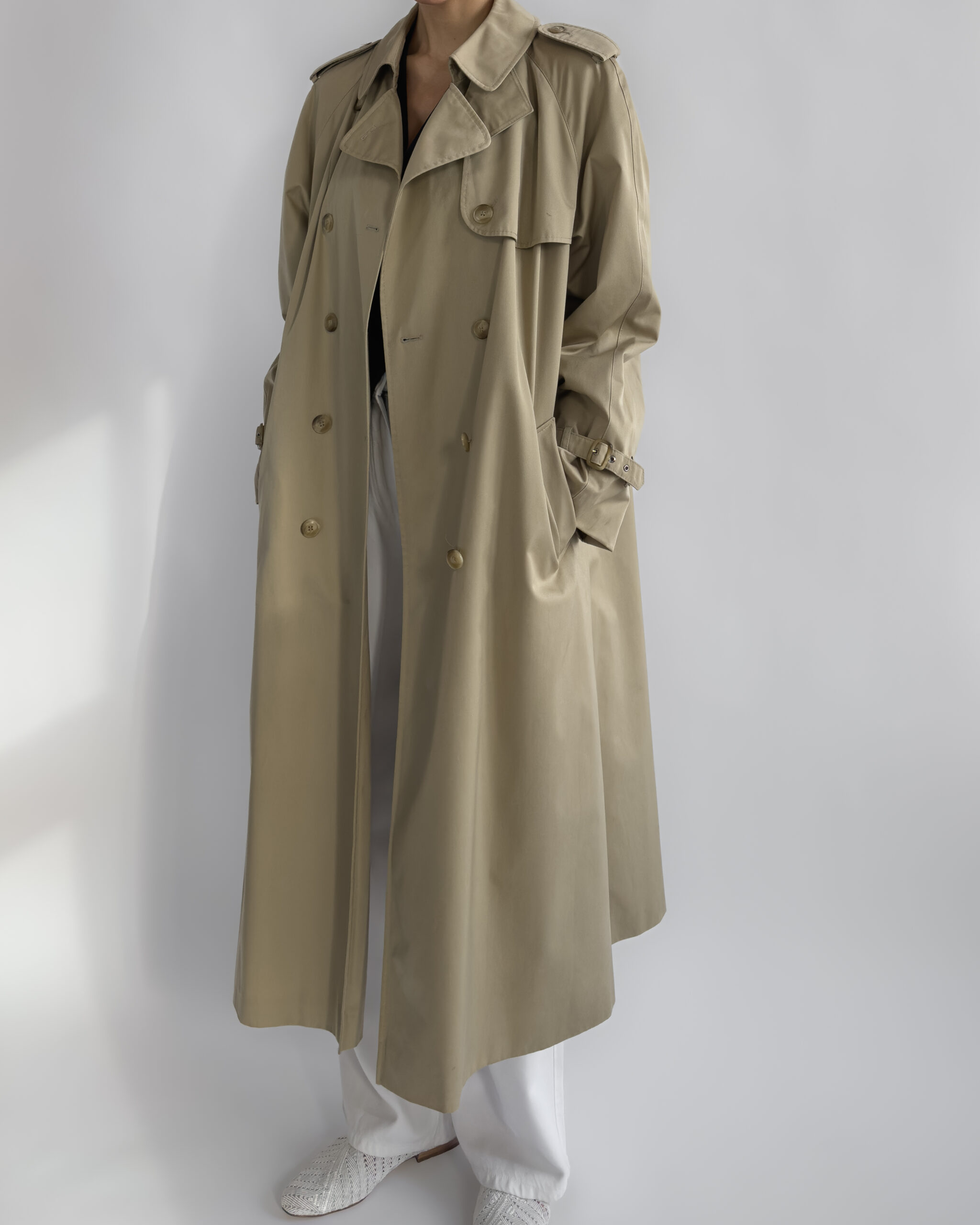 This classic trench coat features a double-breasted front with structured shoulders and wide notched lapels.