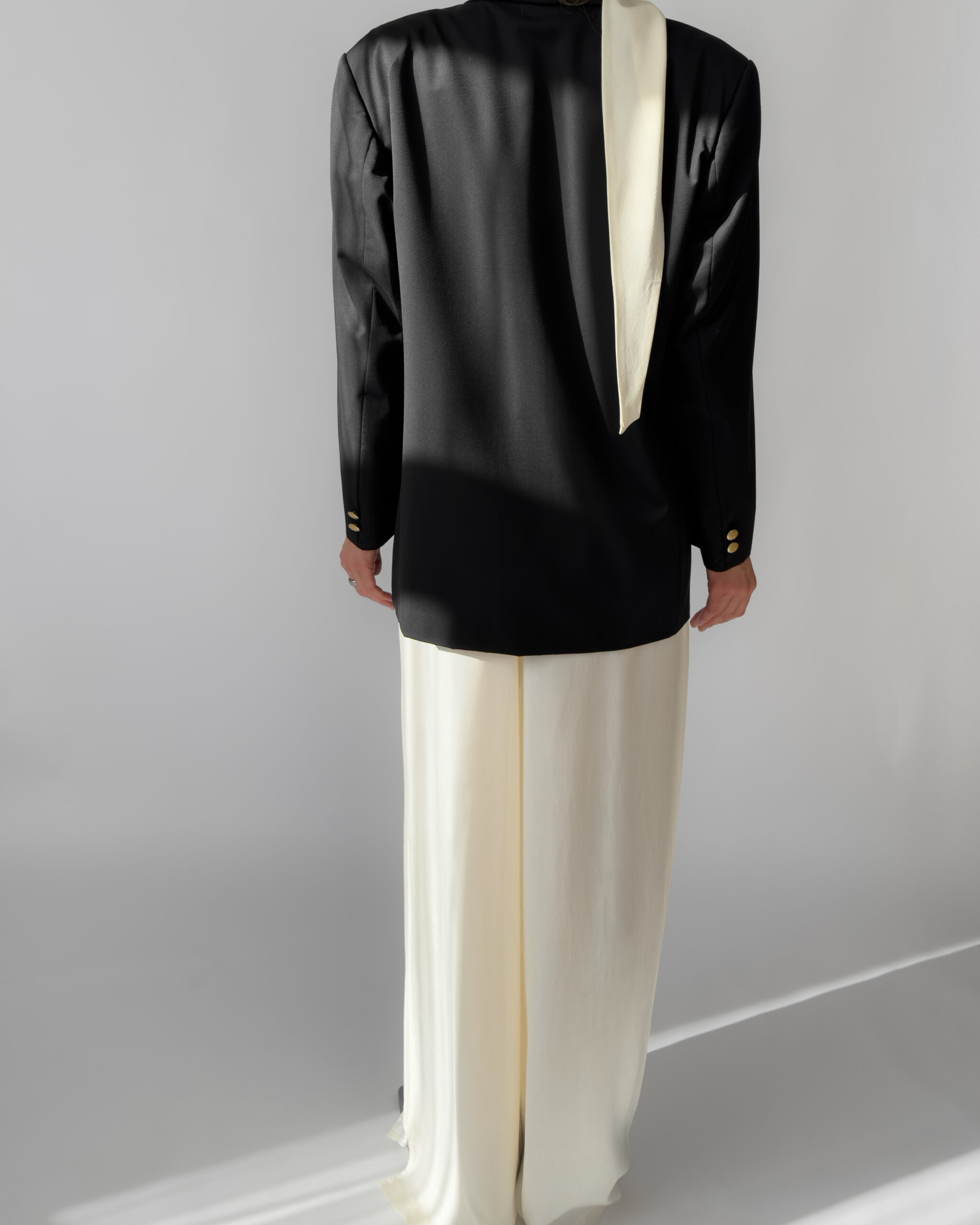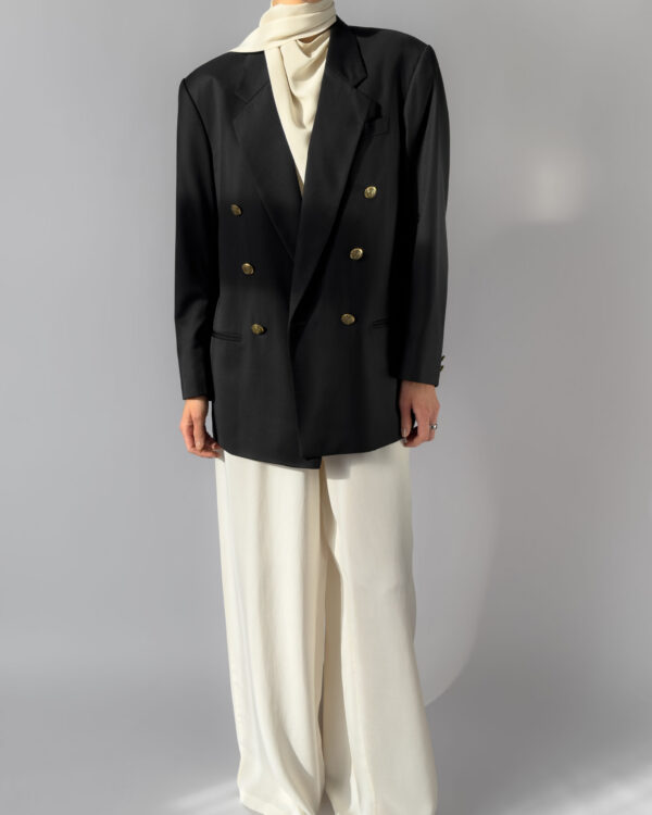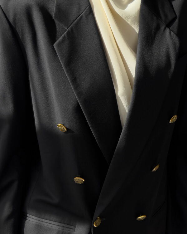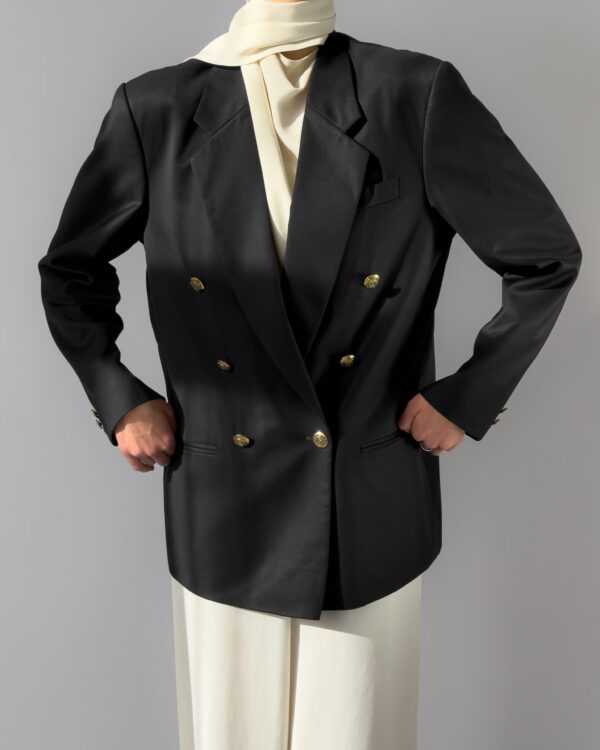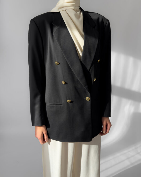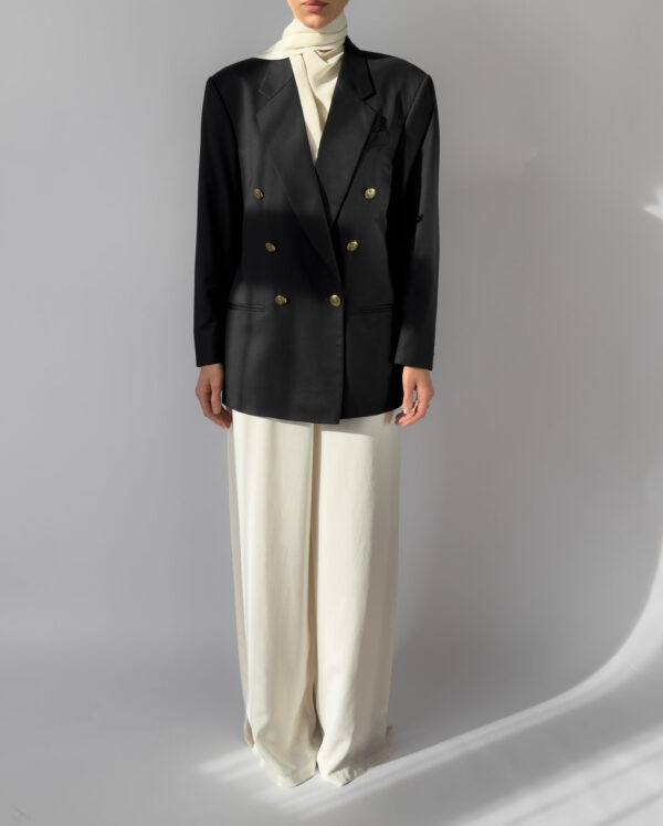 Silky black lining and structured shoulder pads. High-quality wool with viscose lining (no material label).