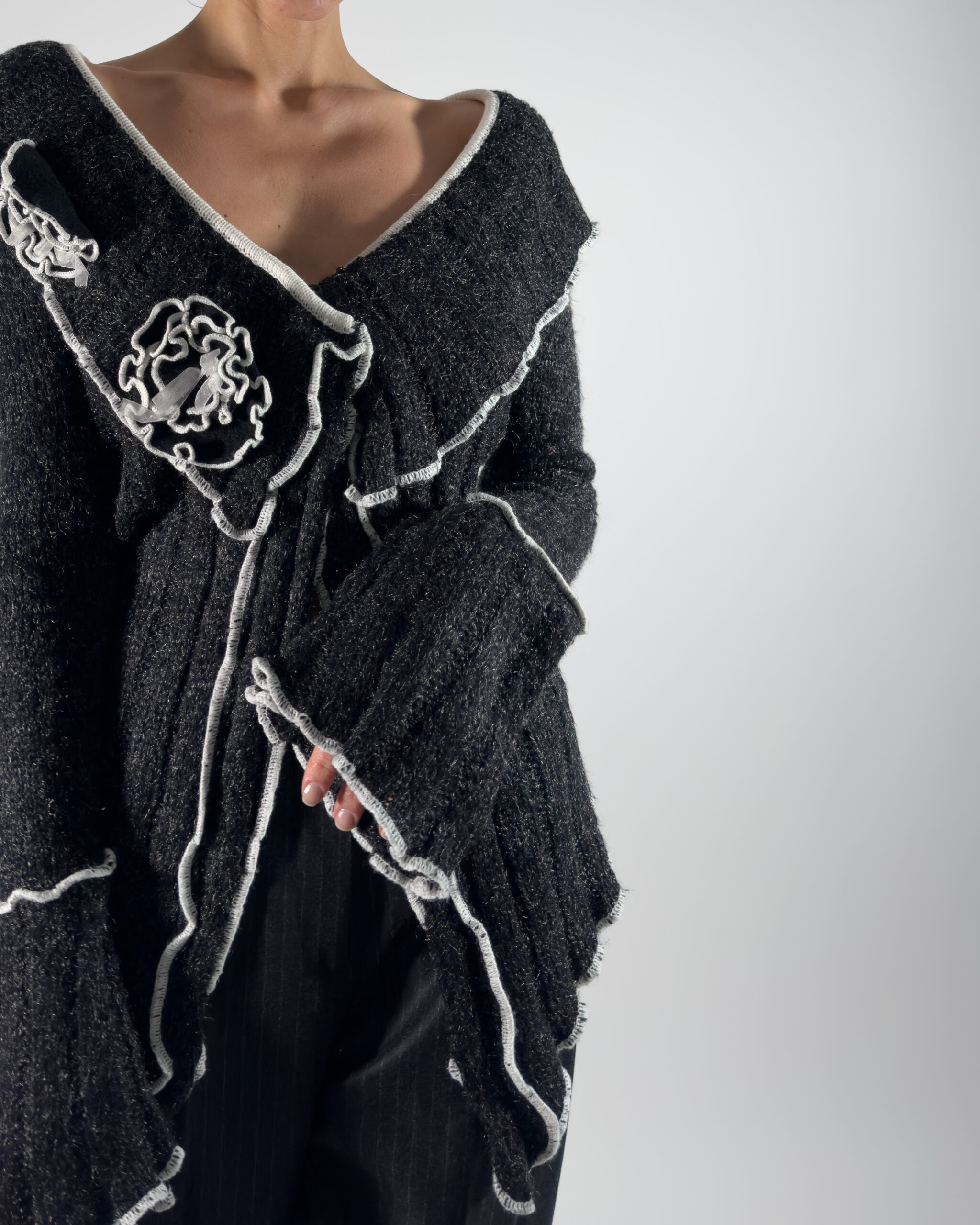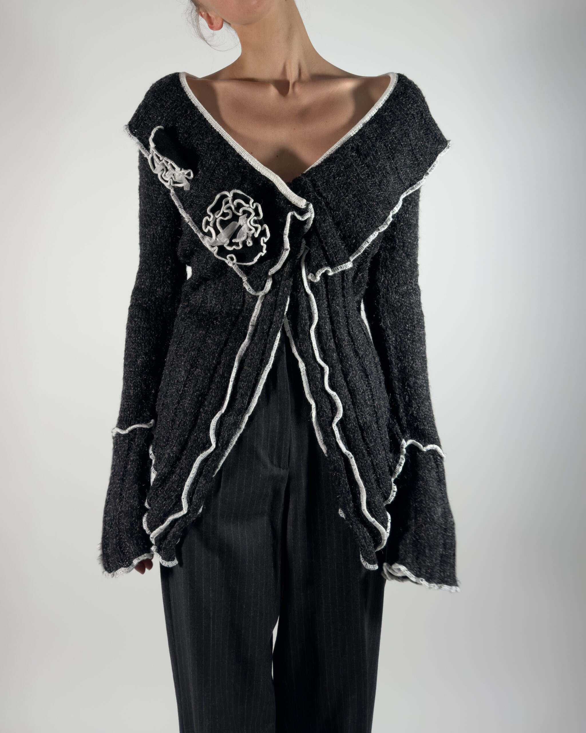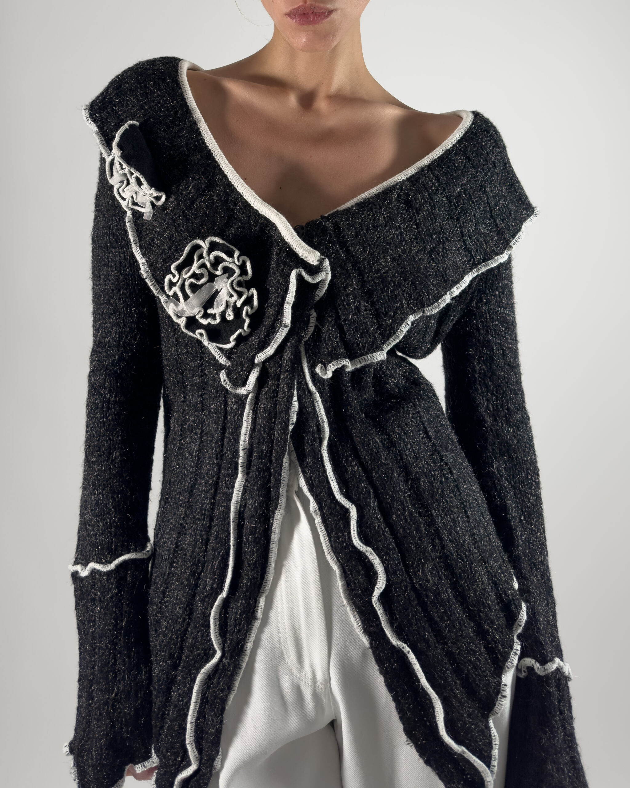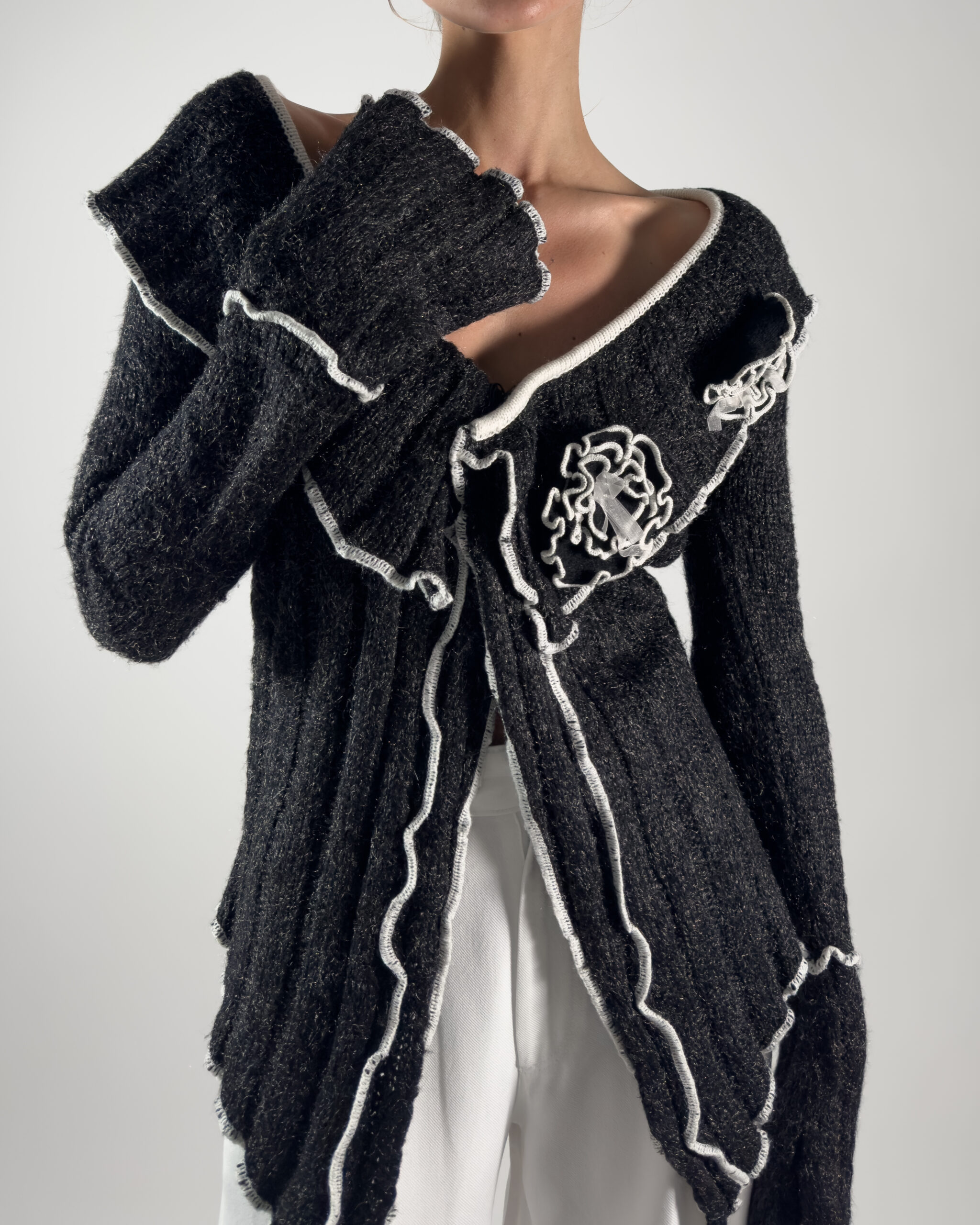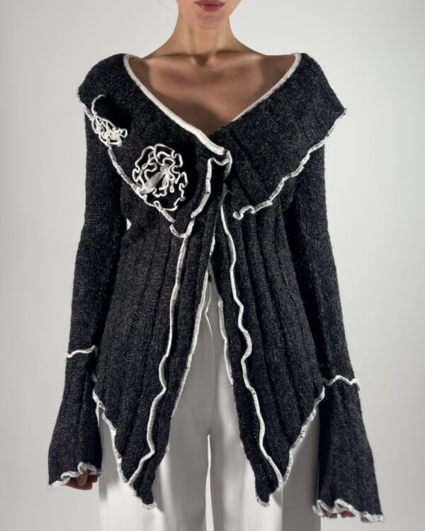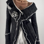 This cardigan features knitted rose details and two button closure. The soft dark grey with white accents makes it versatile for layering or wearing on its own.