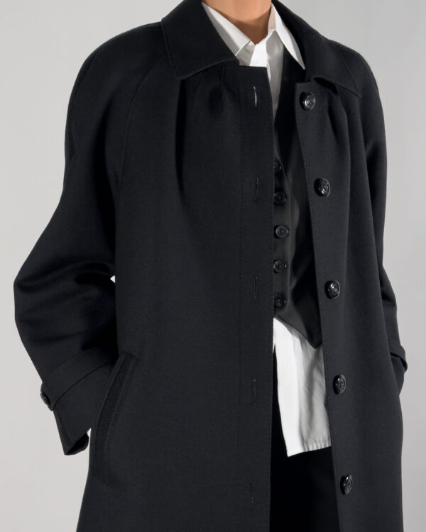 Virgin wool long coat in a sophisticated black with viscose lining.