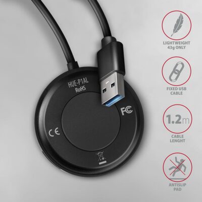 Round shaped USB 3.2 Gen 1 (USB 3.0) hub AXAGON HUE-P1AL with 1.2 m long USB cable fast and easy connects up to four USB devices to computer. Three USB ports are located around the perimeter and allow seamless connection of any USB device incl. bulky flash drives or USB readers. The fourth, upper USB port, is ideal for connecting a wireless adapter for better signal reception or for easy insertion of a flash drive with one hand. The rubber pad prevents slipping up on the table. Permanently attached 120 cm long USB cable is suitable for use with a desktop computer.