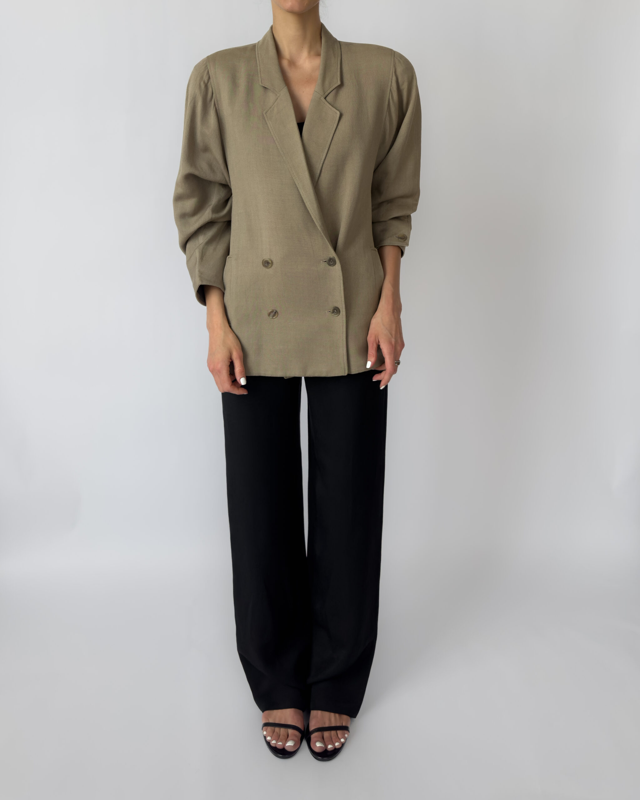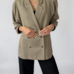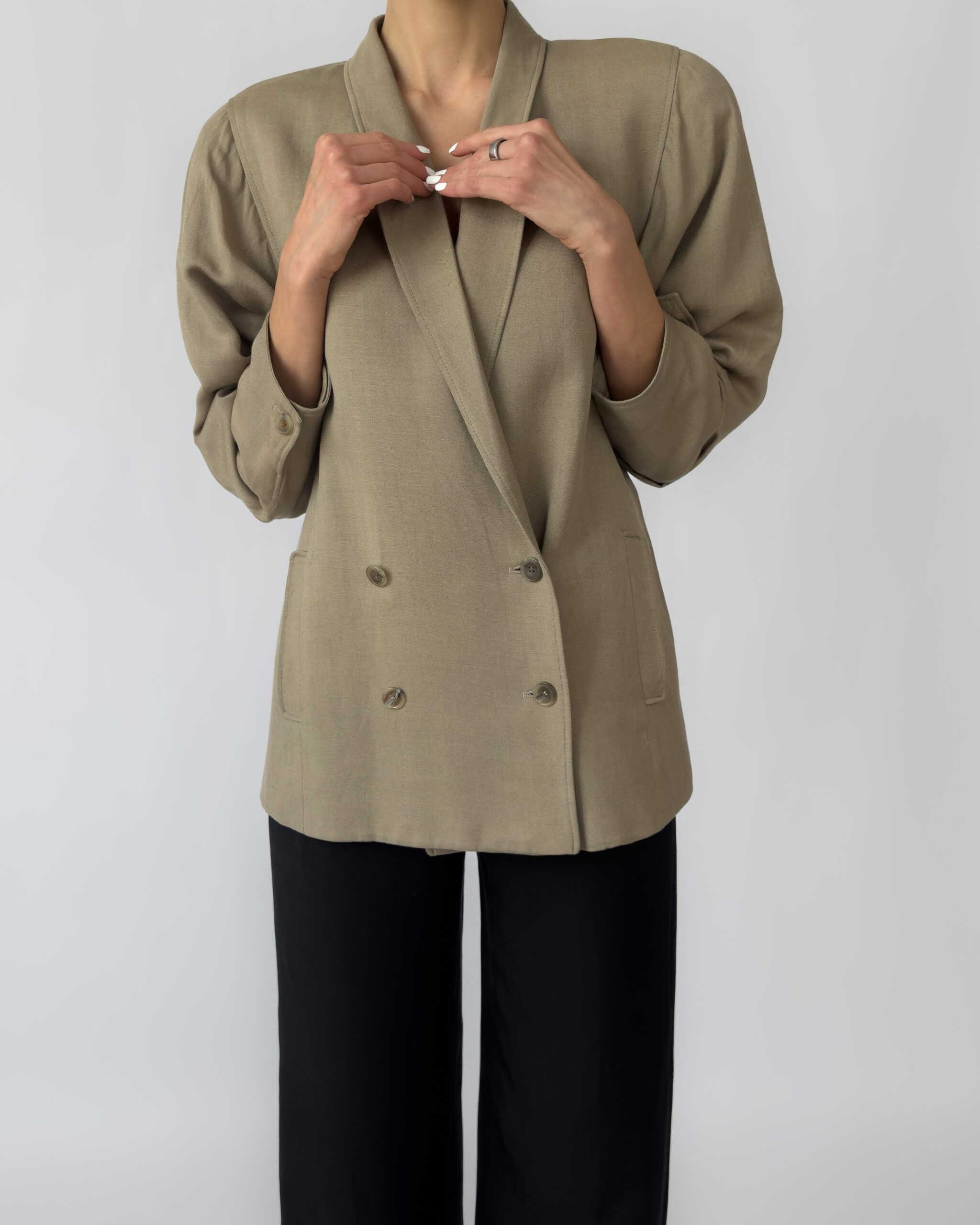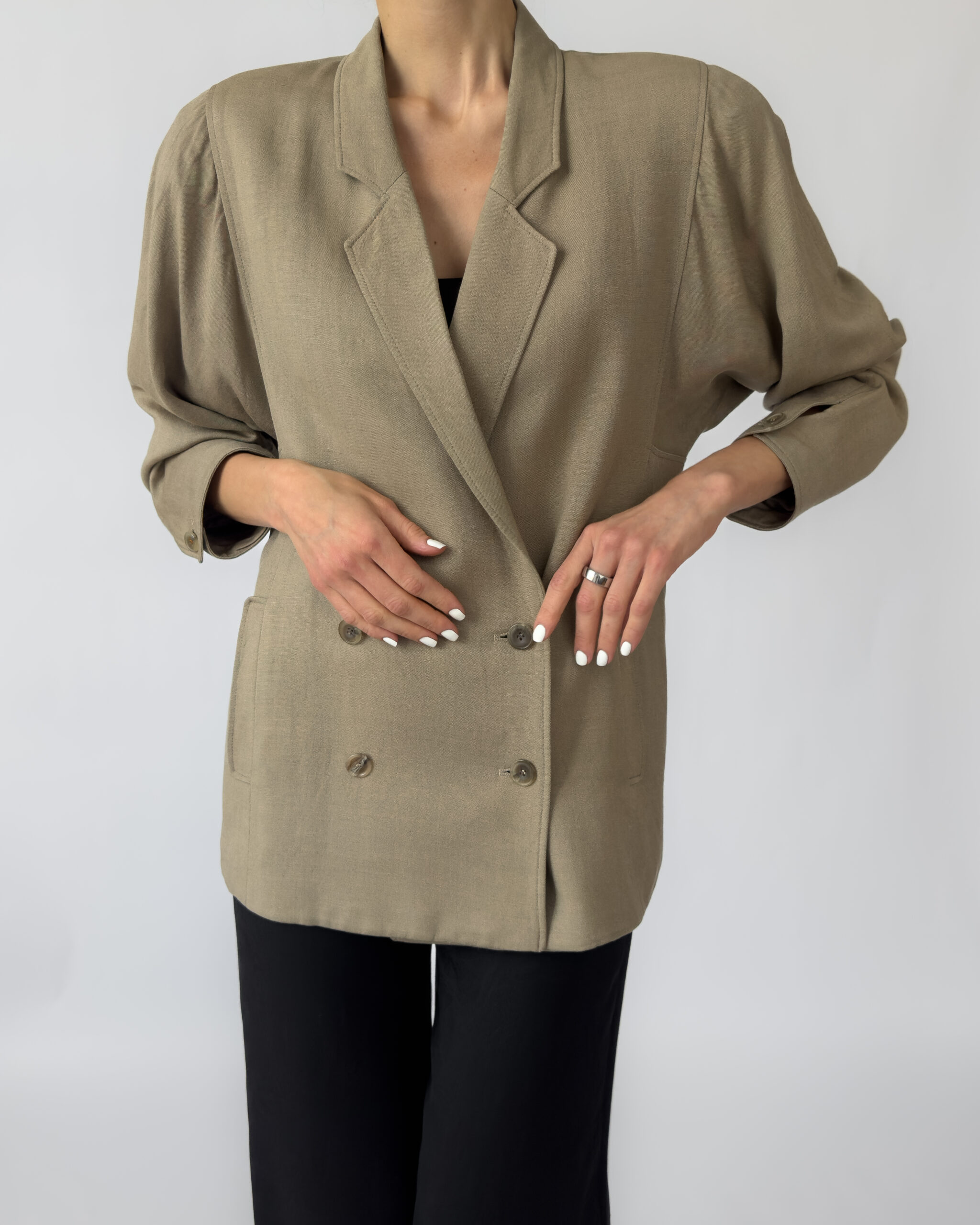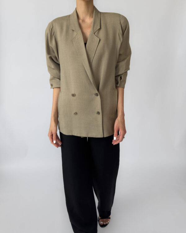 Double-breasted linen jacket in a muted olive green tone. Features a classic button-up closure, subtle shoulder pads, two front pockets, and a silky viscose lining for comfort. Elegant and versatile, perfect for layering in any season.