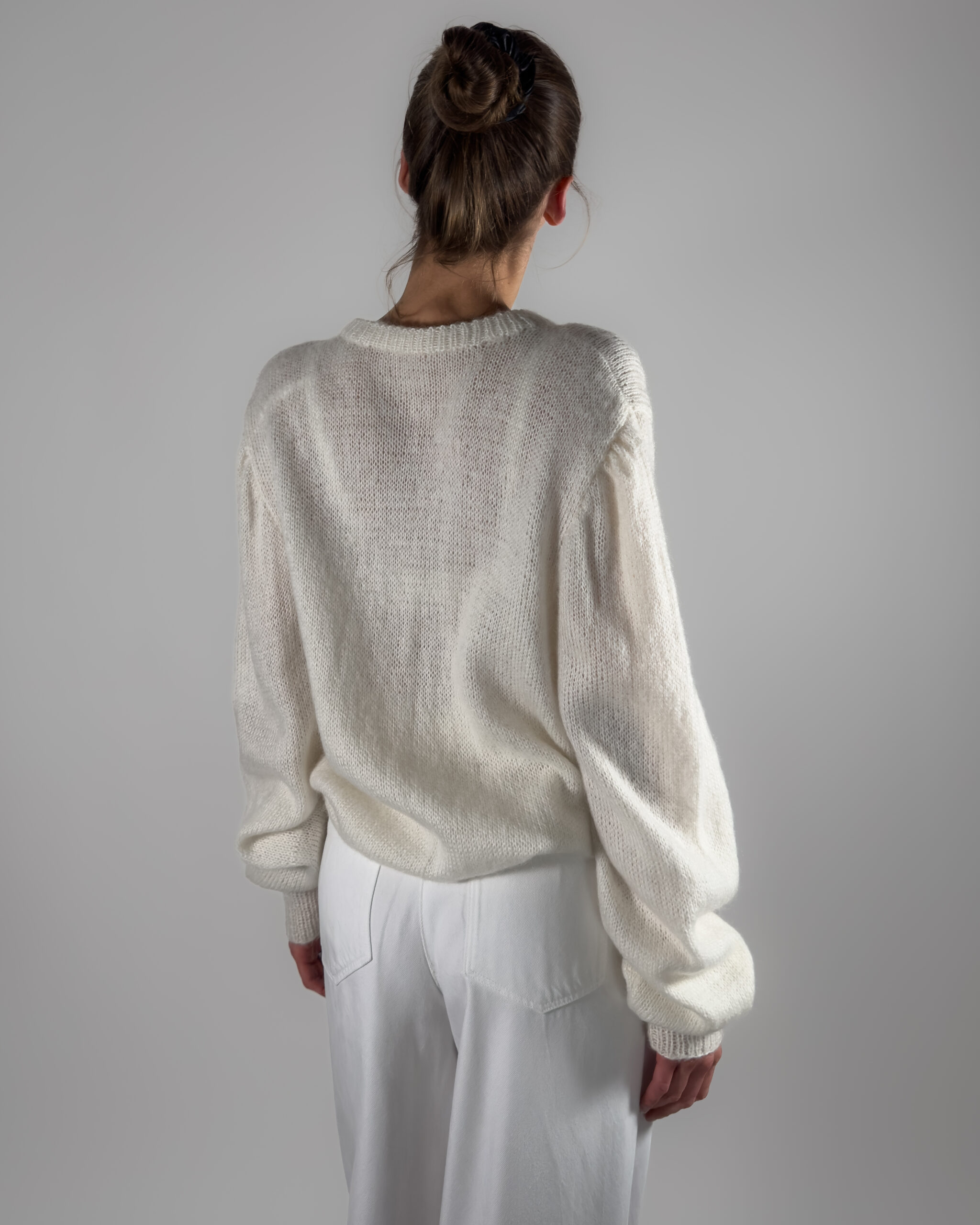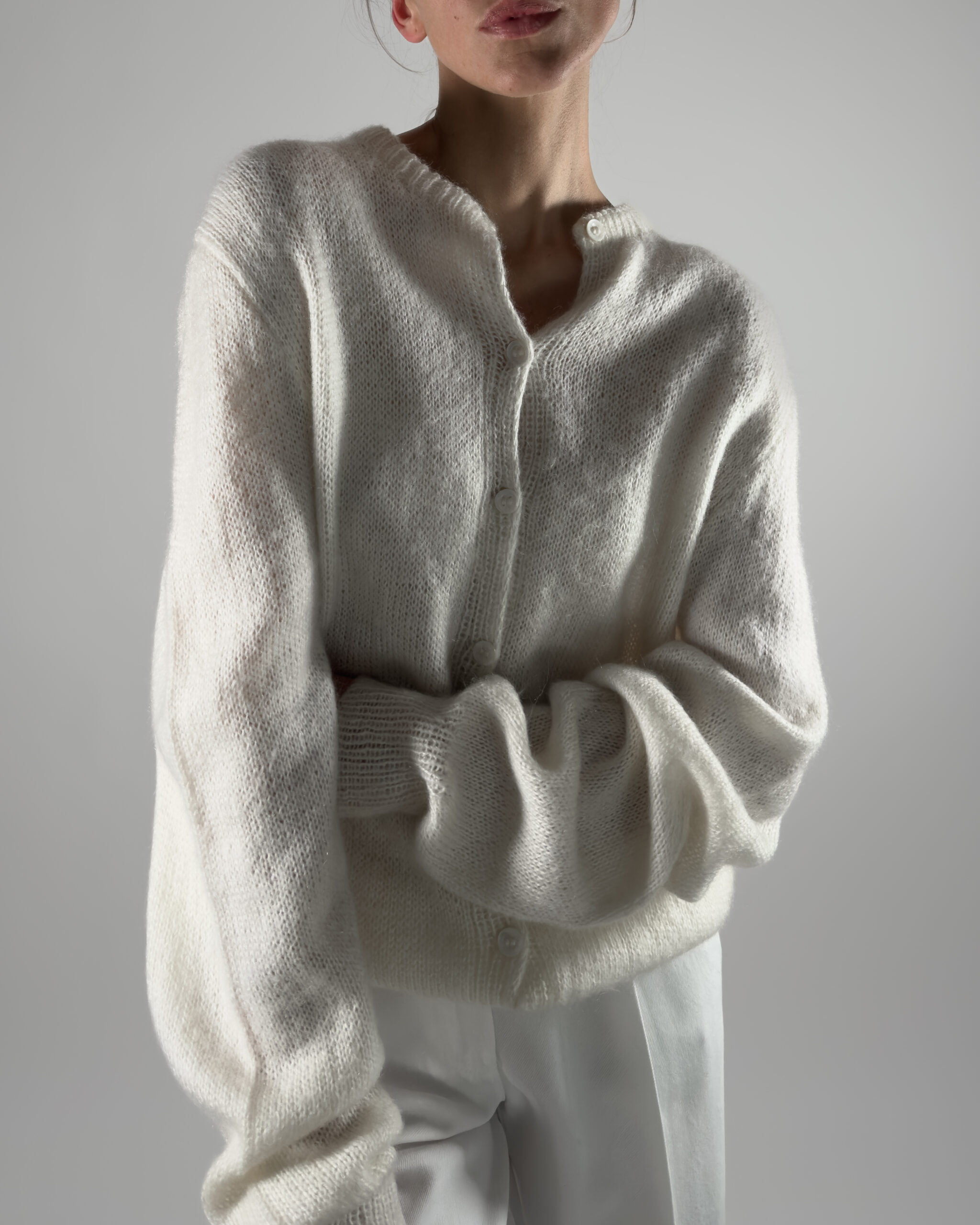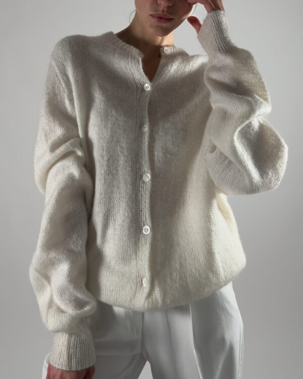 Beautiful handmade oversized mohair cardigan in white. Designed with a soft texture, button-up closure, and elegant balloon sleeves.