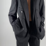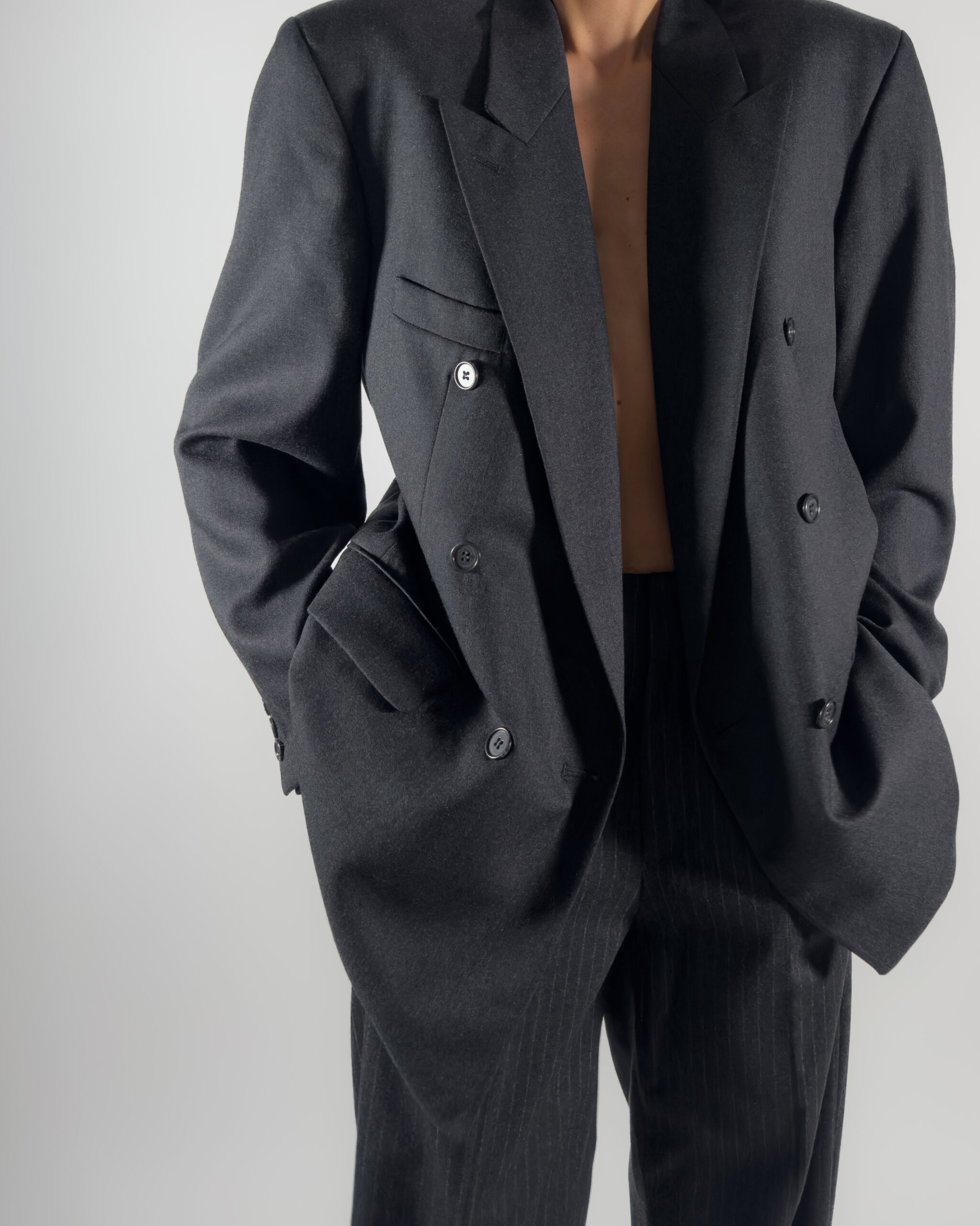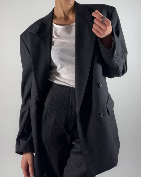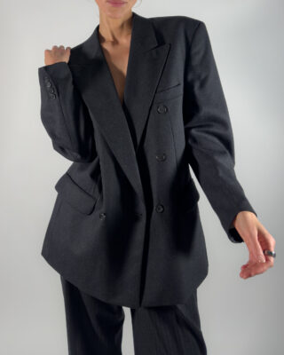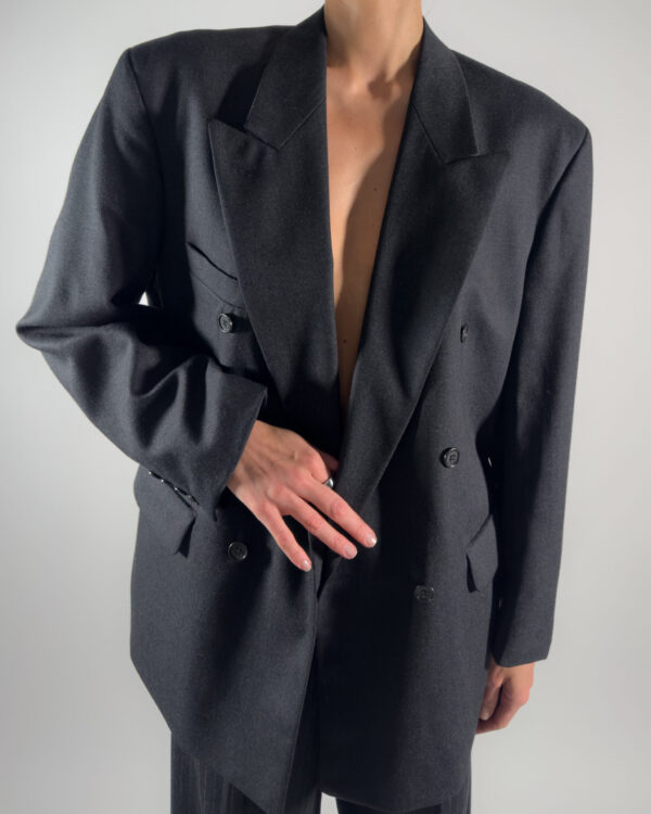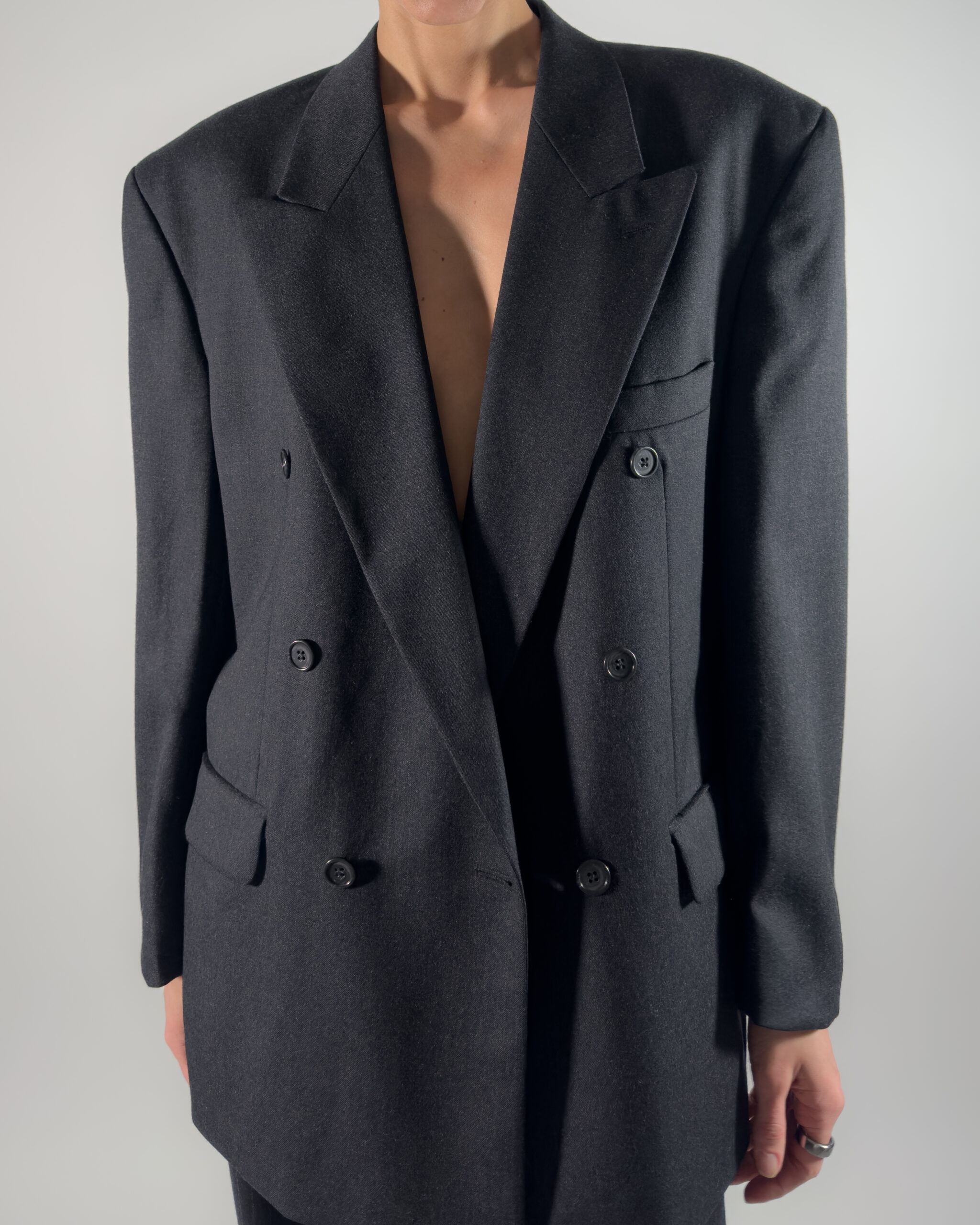 Pierre Cardin blazer made from 100% pure wool. Featuring a double-breasted design, structured shoulder pads, and a classic dark grey hue. Fully lined in viscose.