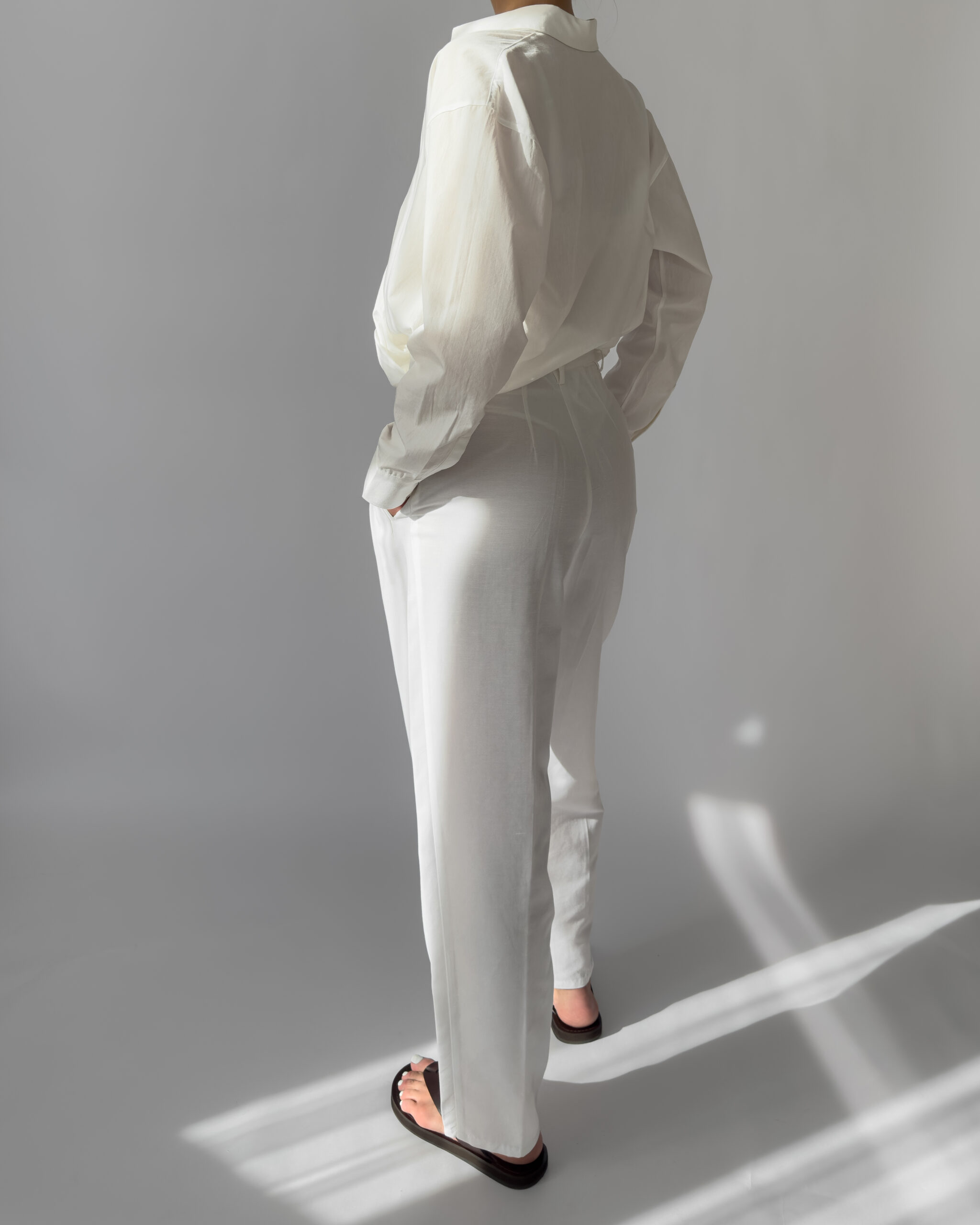 These white pleated trousers from Downtown feature a lightweight linen blend, high waist with belt loops, front zip closure, and side pockets. Perfect for minimalist styling.
