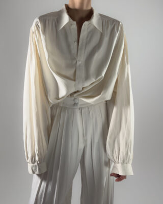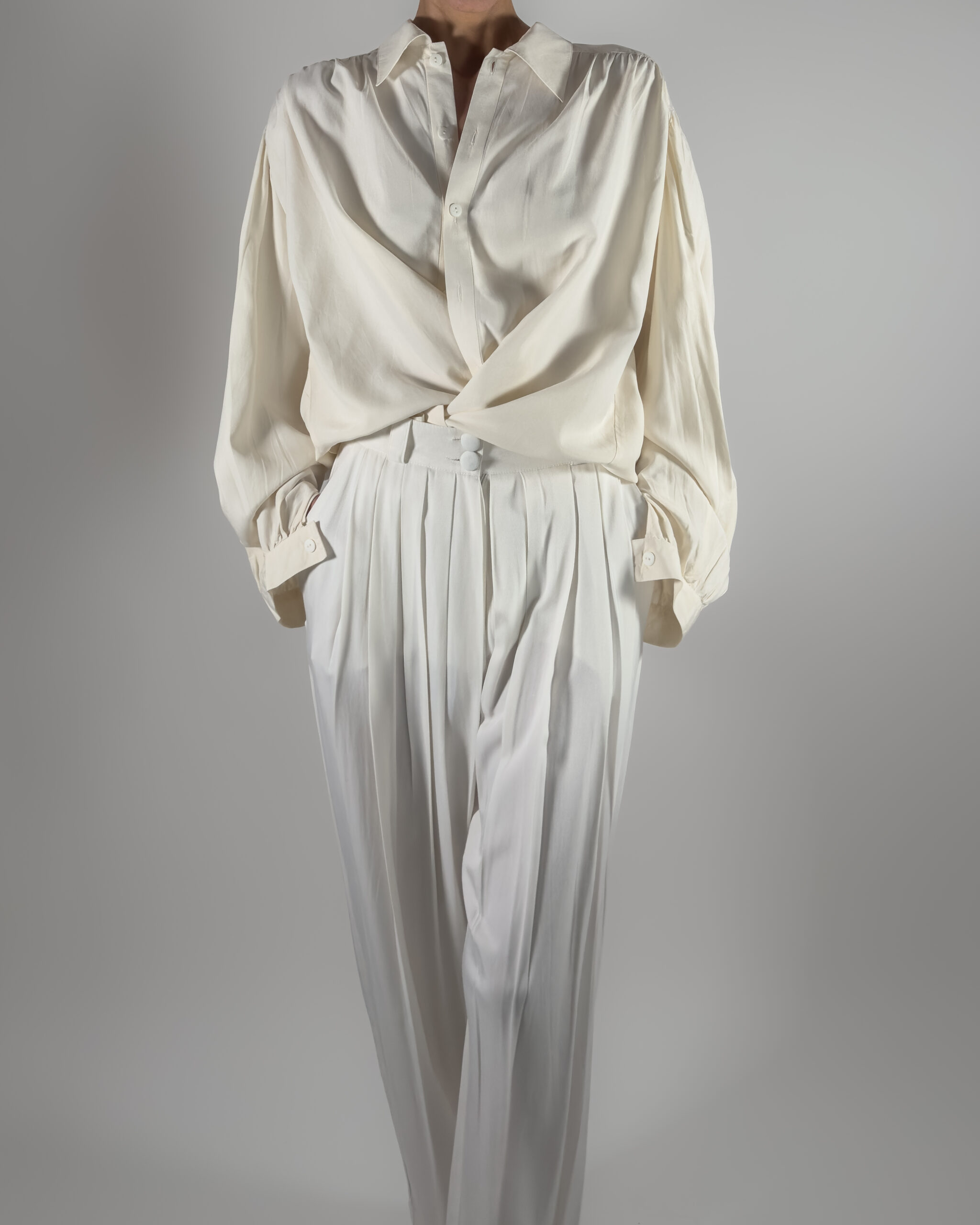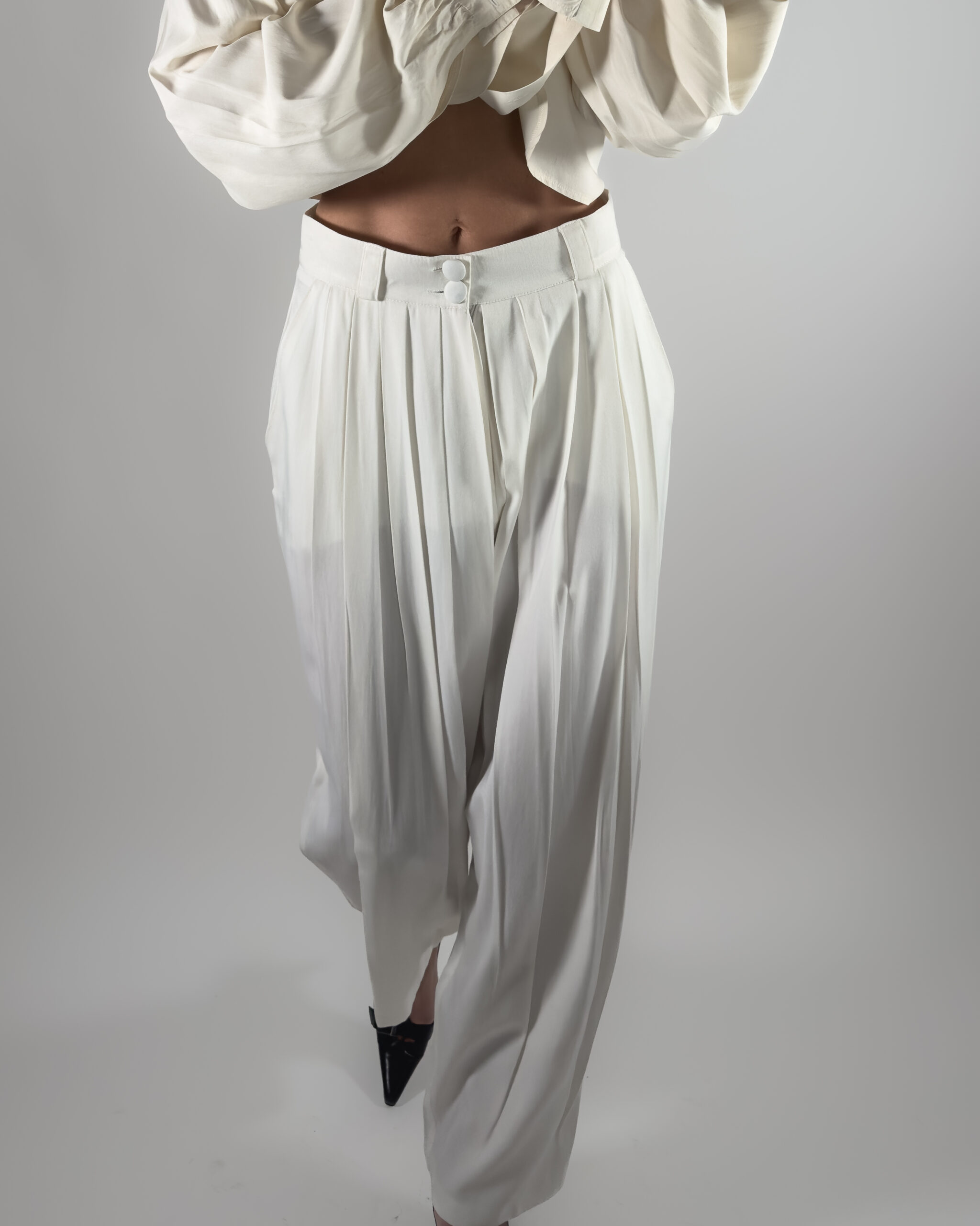 Elegant high-rise trousers in cream white. Designed with pleats, belt holes and front pockets.