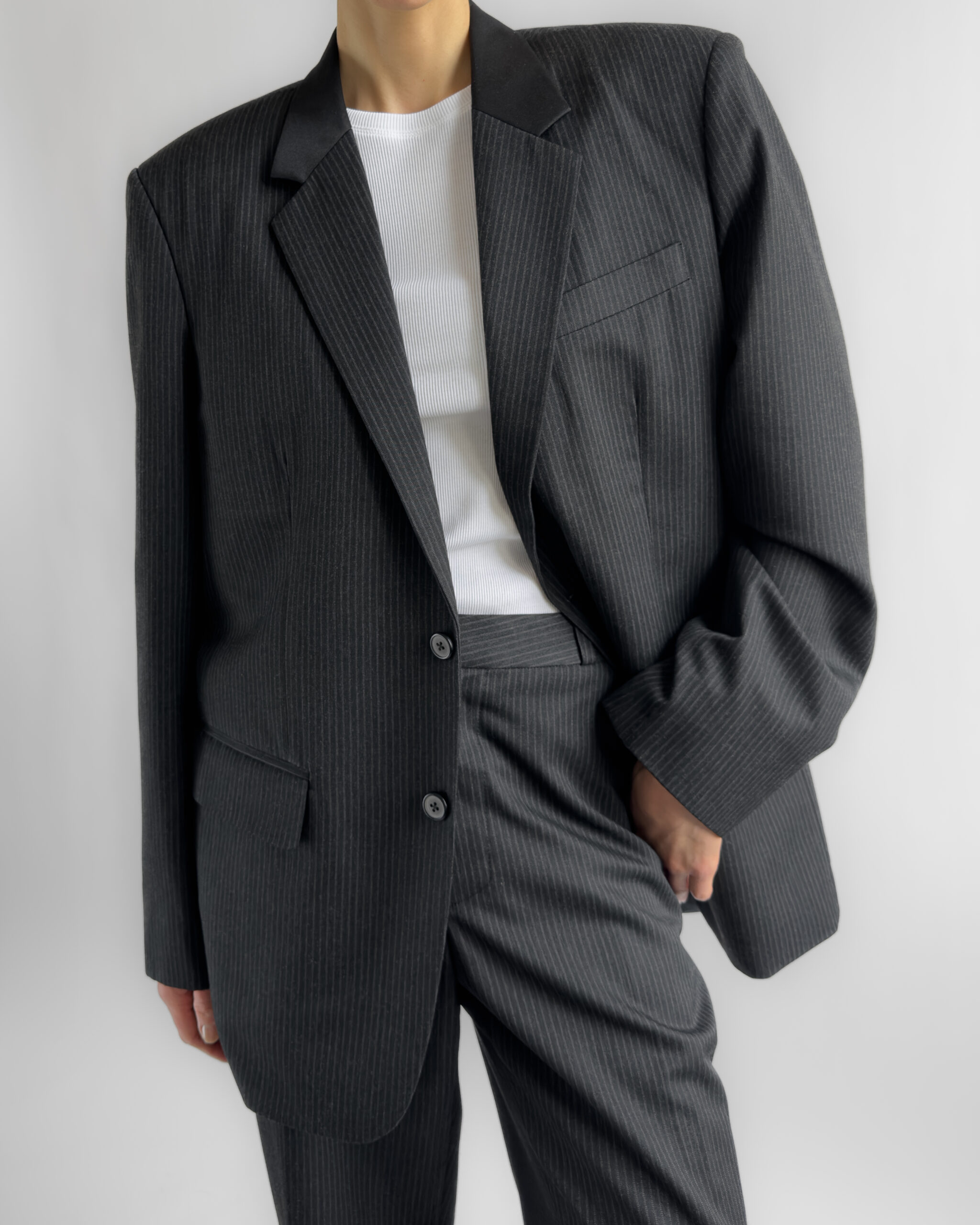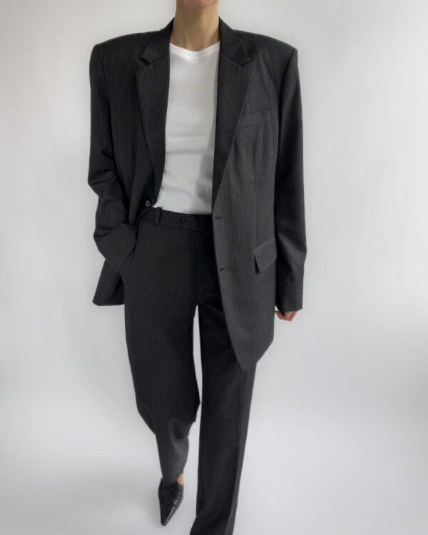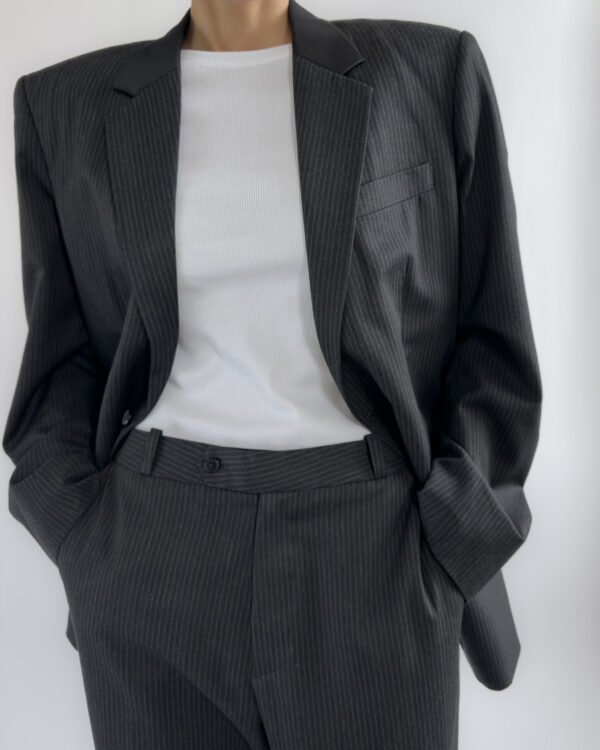 A timeless two-piece tailored suit in a charcoal pinstripe, made with sharp shoulders and a refined silhouette. The blazer features structured shoulder pads, notched lapels, while the matching trousers offer a classic straight-leg fit. Though unlabelled, the material feels like a premium wool blend, fully lined in a smooth viscose.
