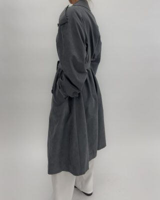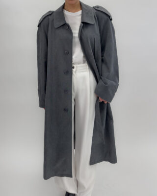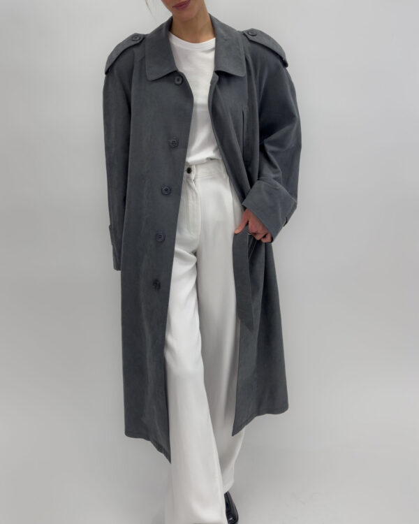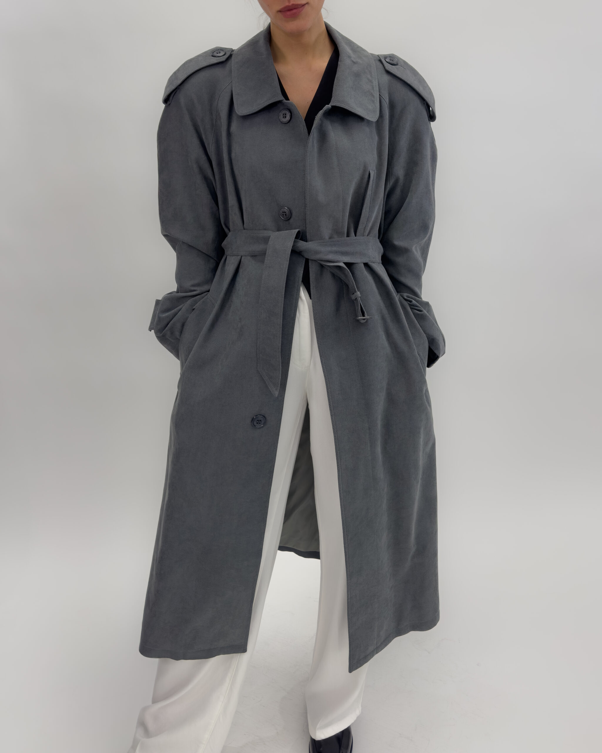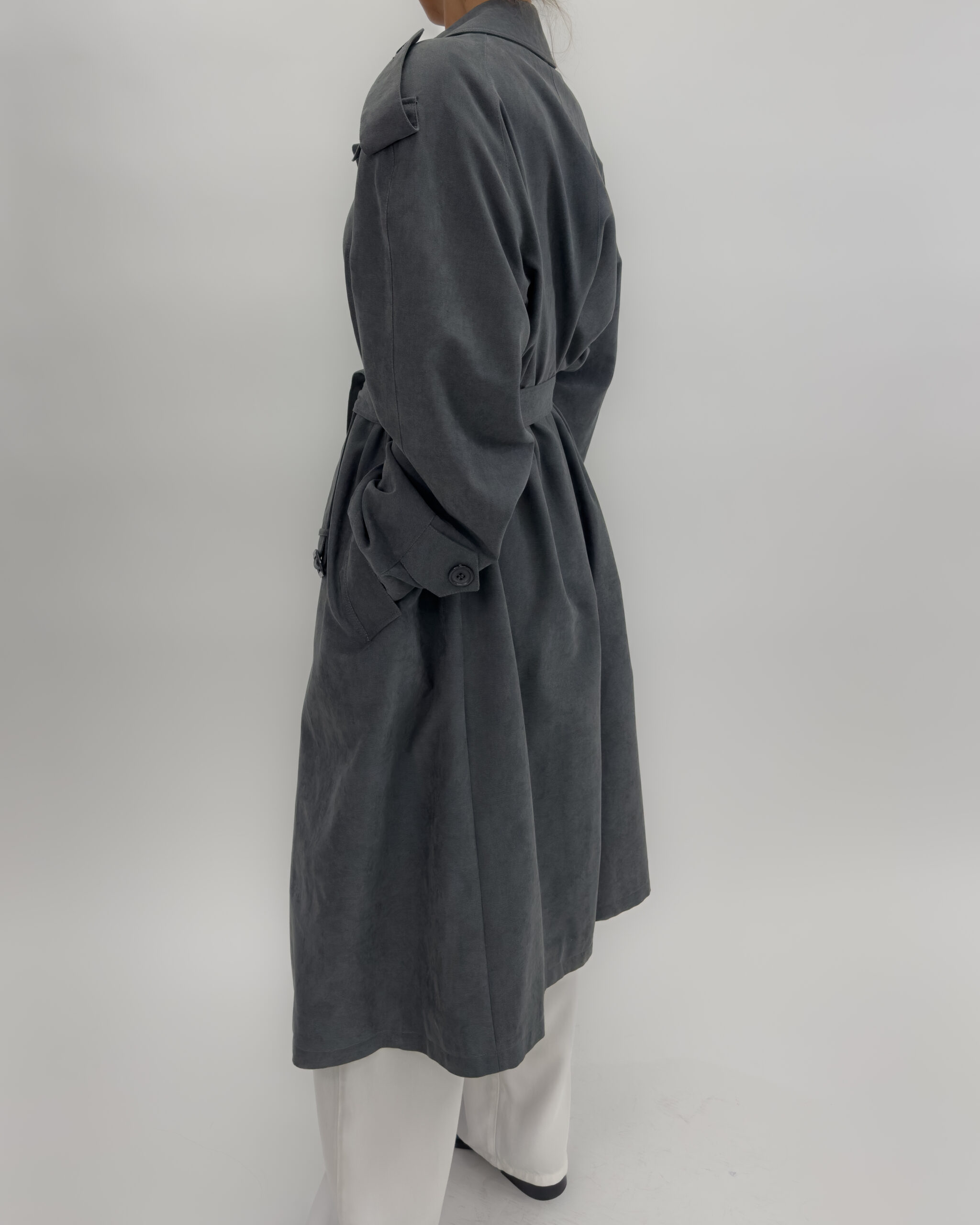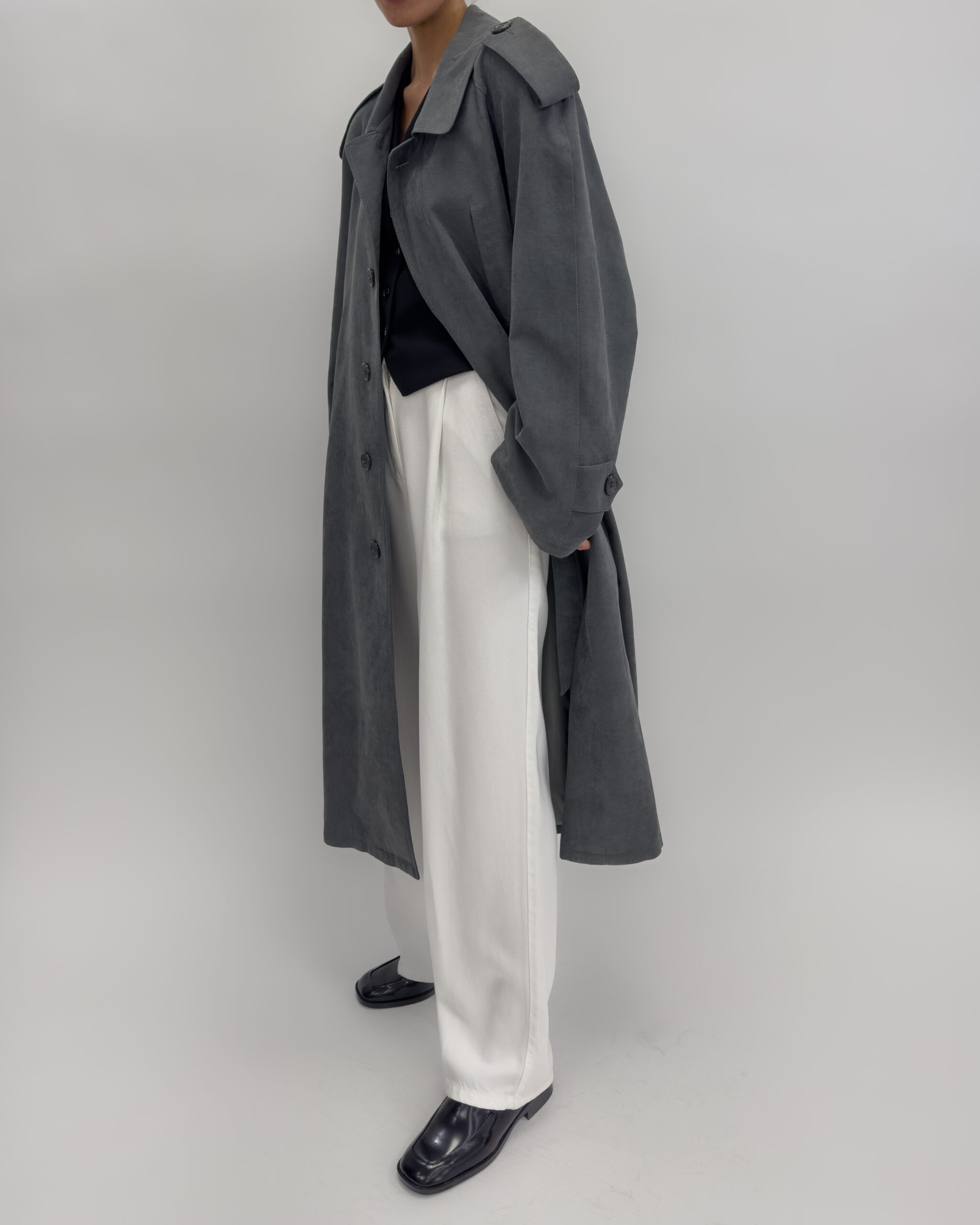 Shoulder pads, button-up front, multiple pockets, belted waist, and back slit